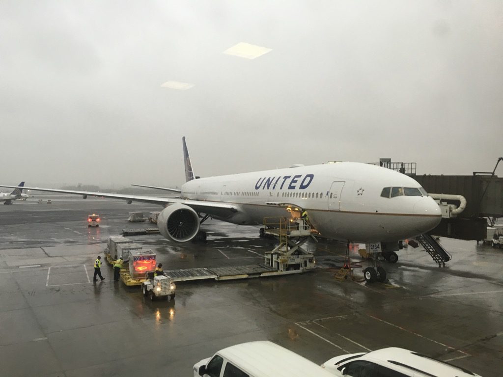 Nach einem kurzen und recht spartanischen Frühstück habe ich mich auf den Weg zum Gate nach San Francisco gemacht. United unterteilt den Einsteigevorgang in fünf Gruppen. Zwar darf man als Business Class Passagiere mit der ersten Gruppe einsteigen, allerdings dürfen dies neben den 60 Business Class Passagieren auch United Vielflieger mit 1K und Platinum Status. So standen in der Schlange für Gruppe 1 etwa 100 Passagiere an. Artig in der Schlange wartend, freute ich mich endlich einen ersten Blick auf die neue United Boeing 777-300er im Regen zu erhaschen.
