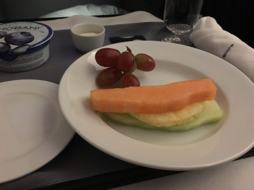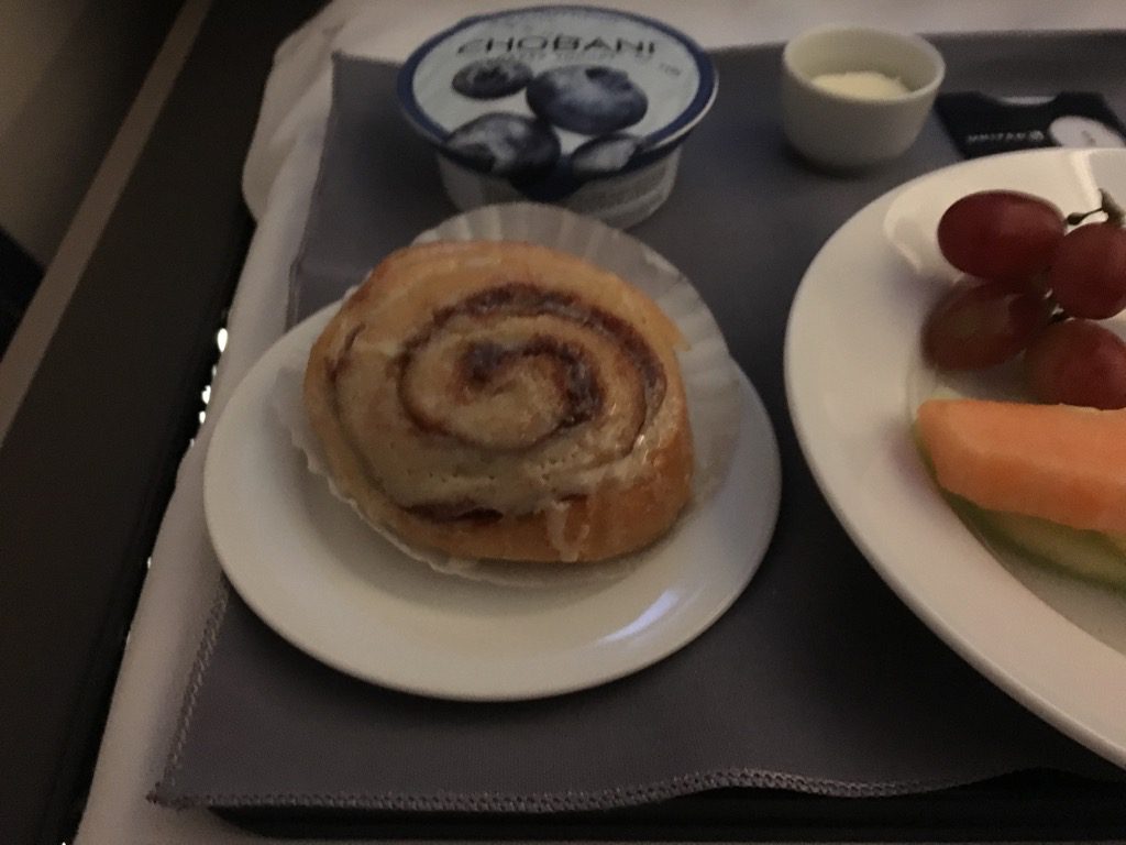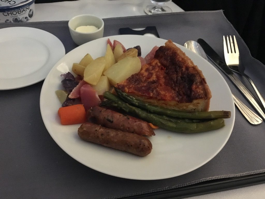 Die Quiche war deutlich besser, als man es von Eierspeisen im Flugzeug erwartet. Sehr würzig und schmackhaft. Ich habe in Hotels in den USA schon schlechteres zum Frühstück serviert bekommen.