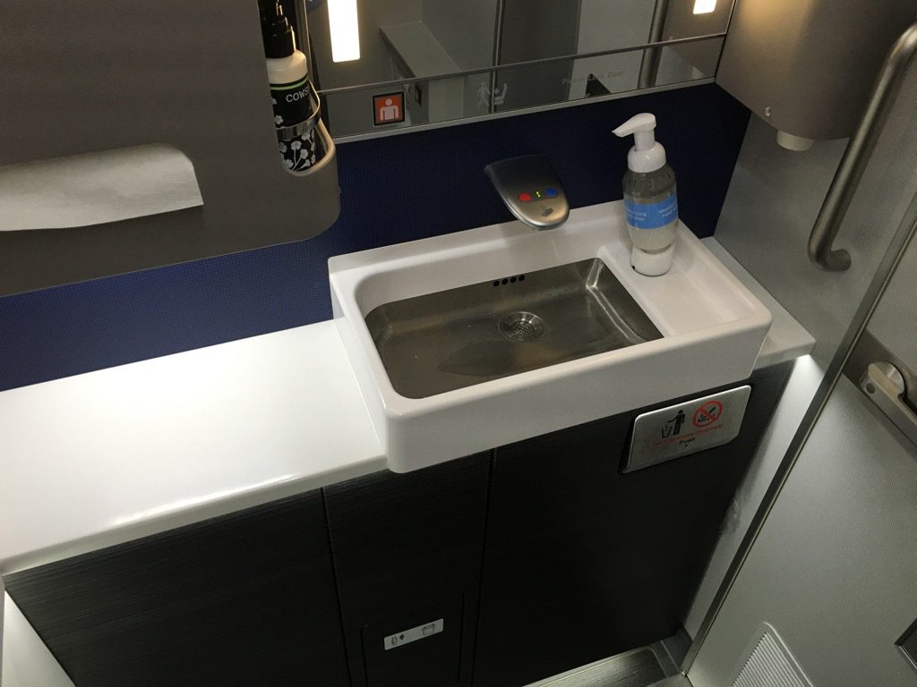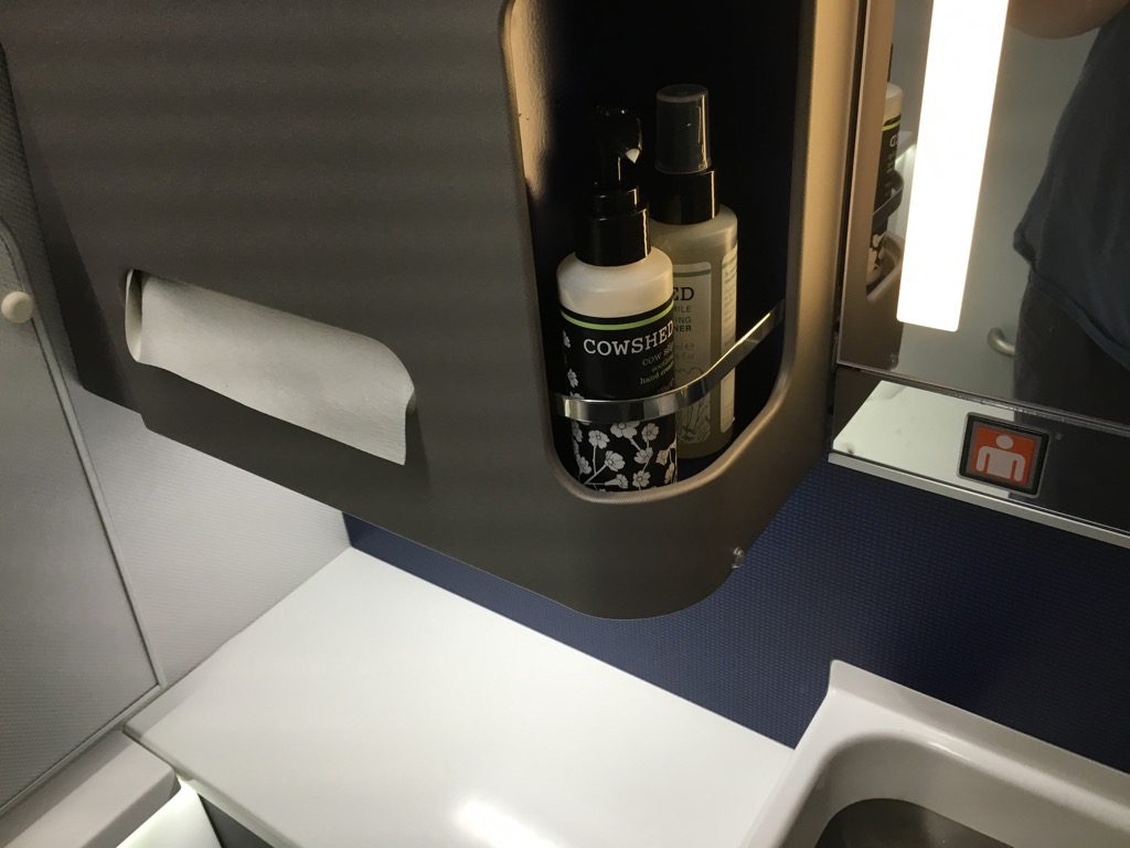 Auch in den Waschräumen der Boeing 777-300er will United zeigen, dass man ein neues, hochwertiges Flugzeug in der Flotte hat. Diese wirkte mehr wie ein Badezimmer am Boden, als eine Flugzeugtoilette wie man sie im Allgemeinen kennt.