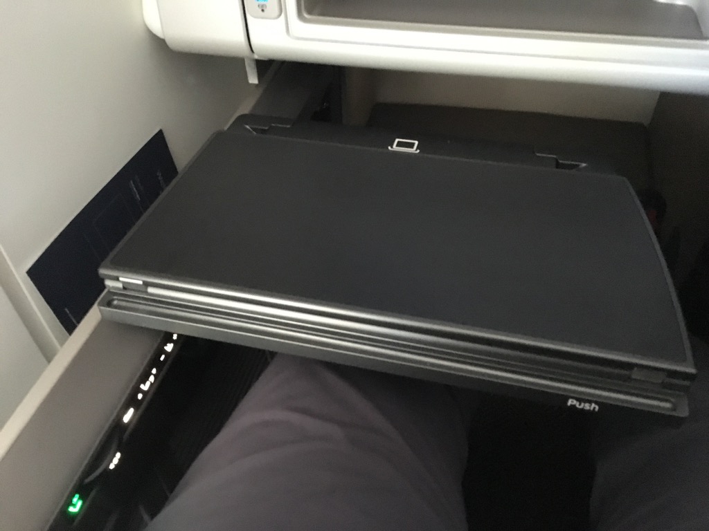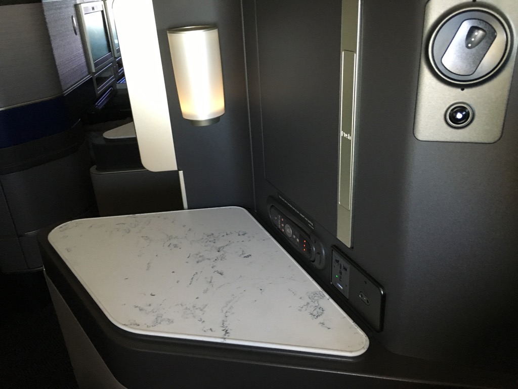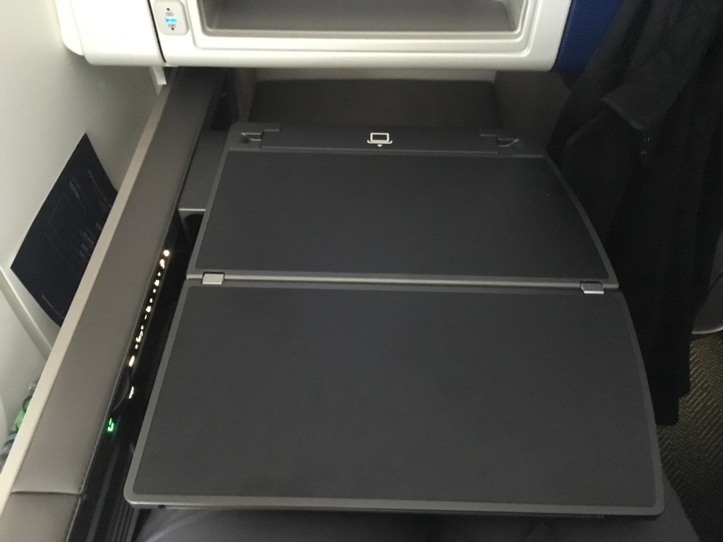 Der Tisch des United Polaris Business Class Sitzes in der Boeing 777-300er war angenehm groß und ließ sich in alle Richtungen verstellen. Auch war er stabil genug um darauf zu arbeiten.