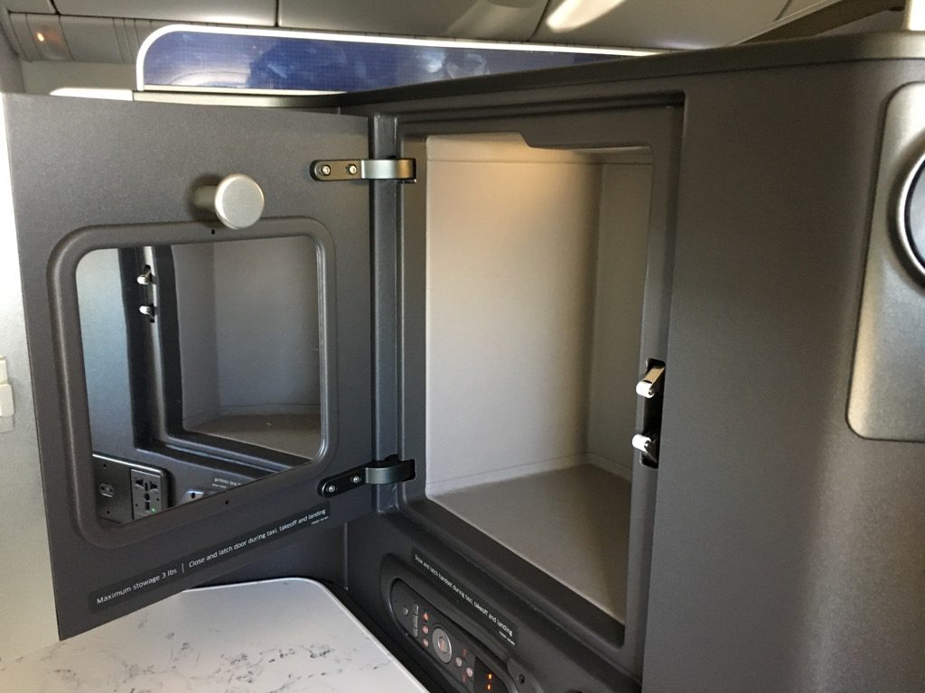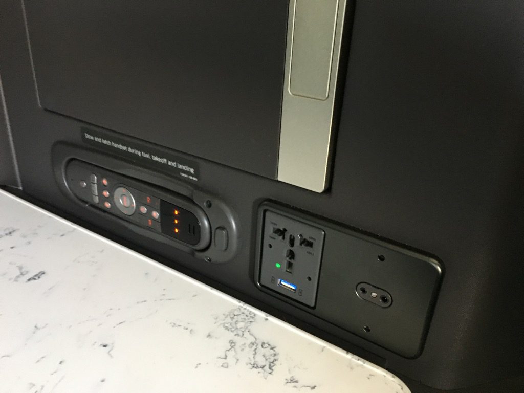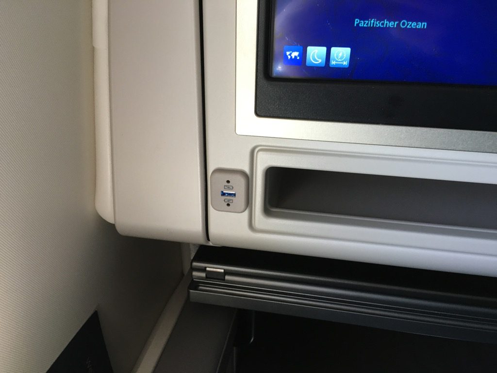 Wie es sich für einen moderen Business Class Sitz gehört, gab es direkt neben dem Sitz eine internationale 110V Steckdose, sowie einen weiteren USB Anschluss unter dem Fernseher. Hier konnte man von seinem Smartphone oder Tablett auch Bilder und Filme auf dem Bildschirm des Sitzes anschauen.