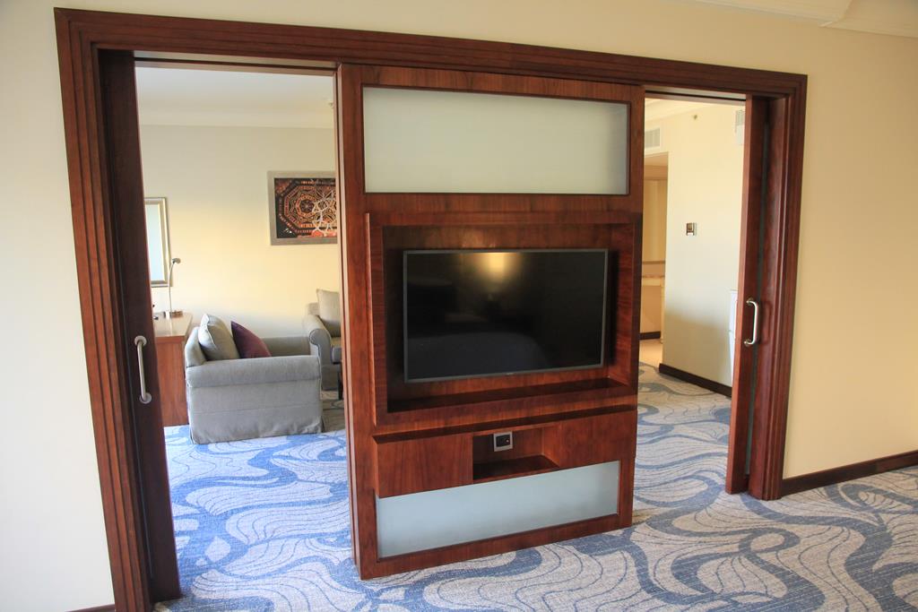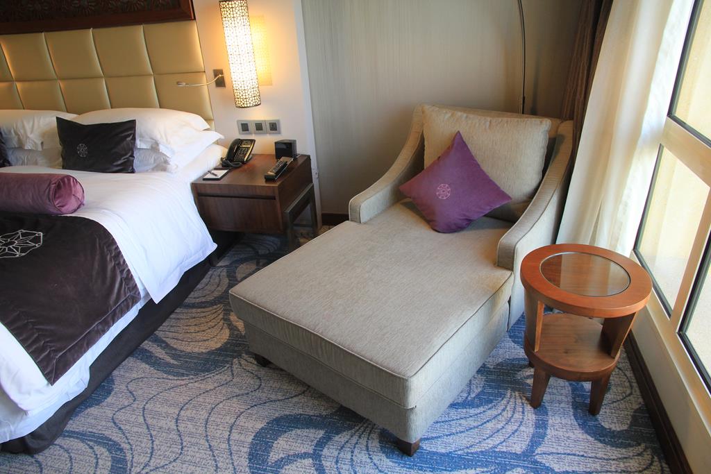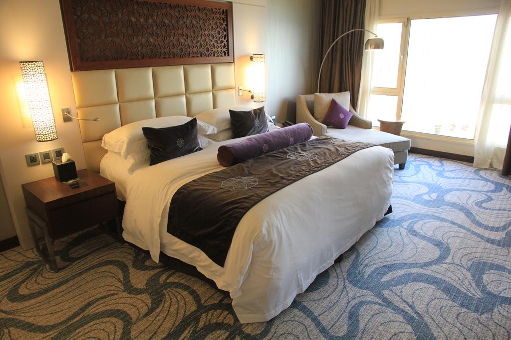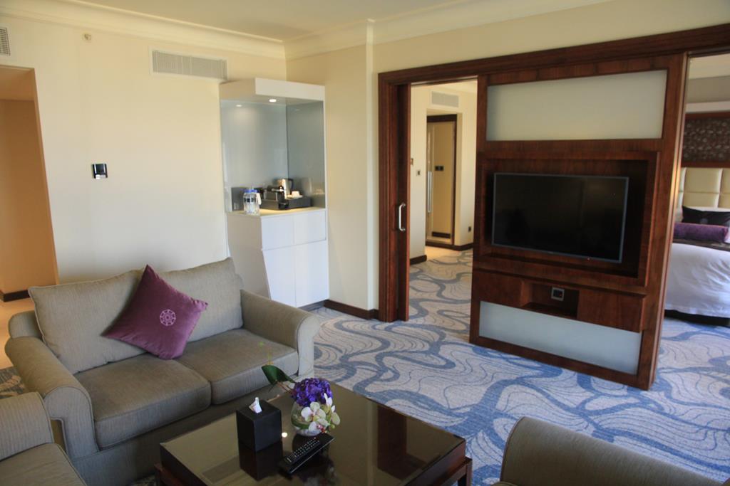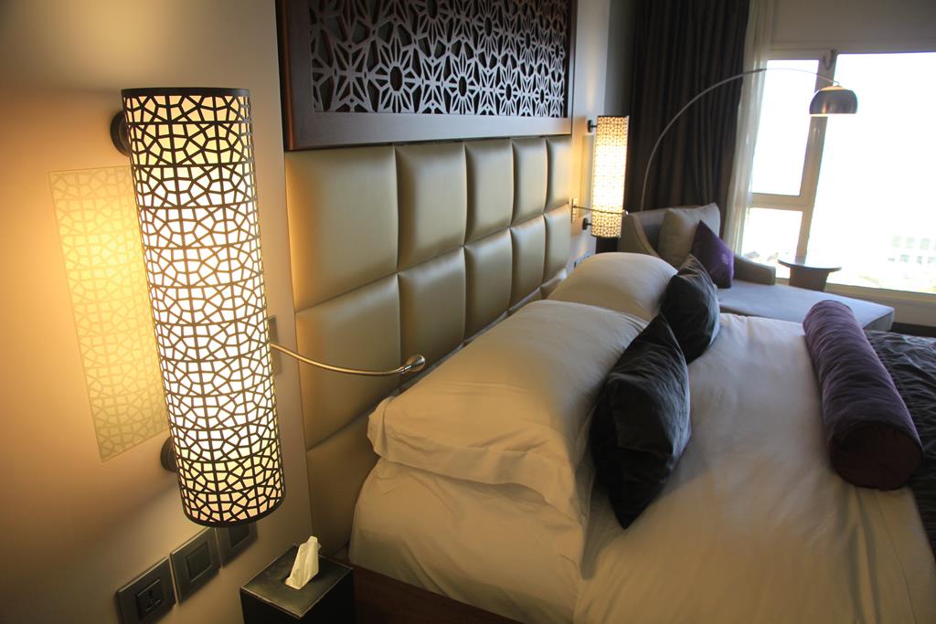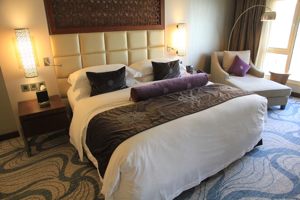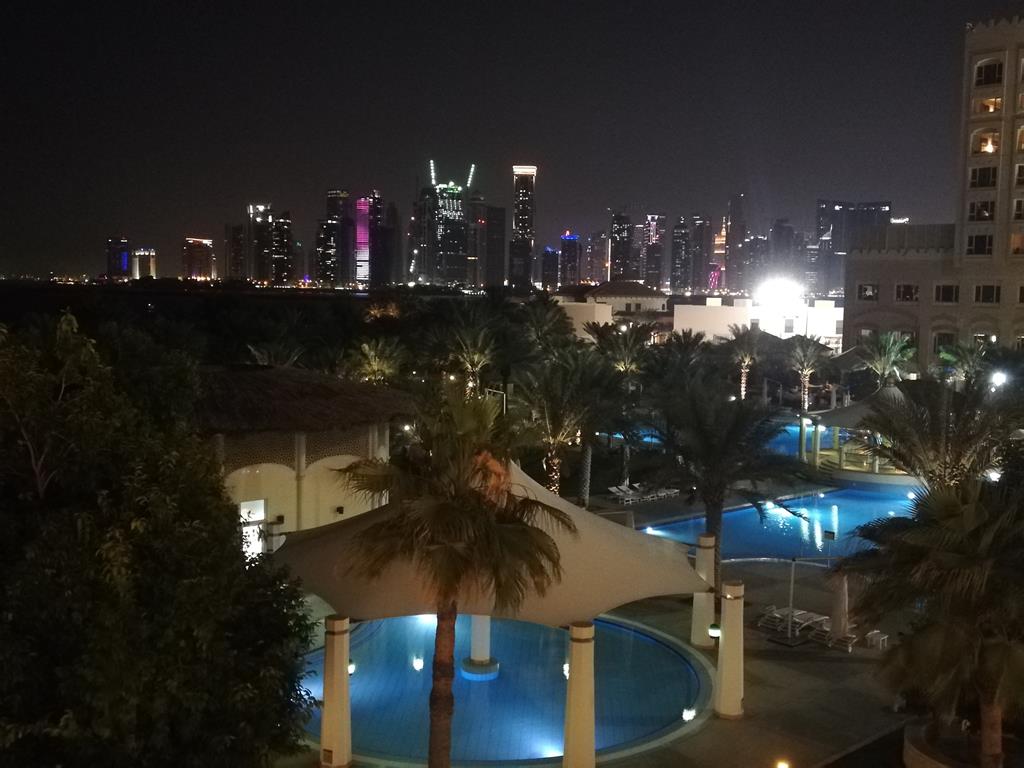 Die Zimmer verfügen über eine große Fensterfront, von der man einen tollen Ausblick über das Hotel aber auch die Skyline von Doha hatte.