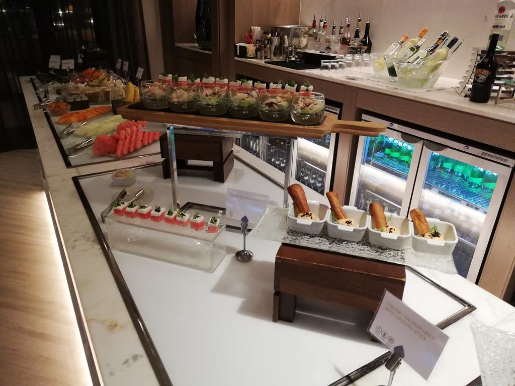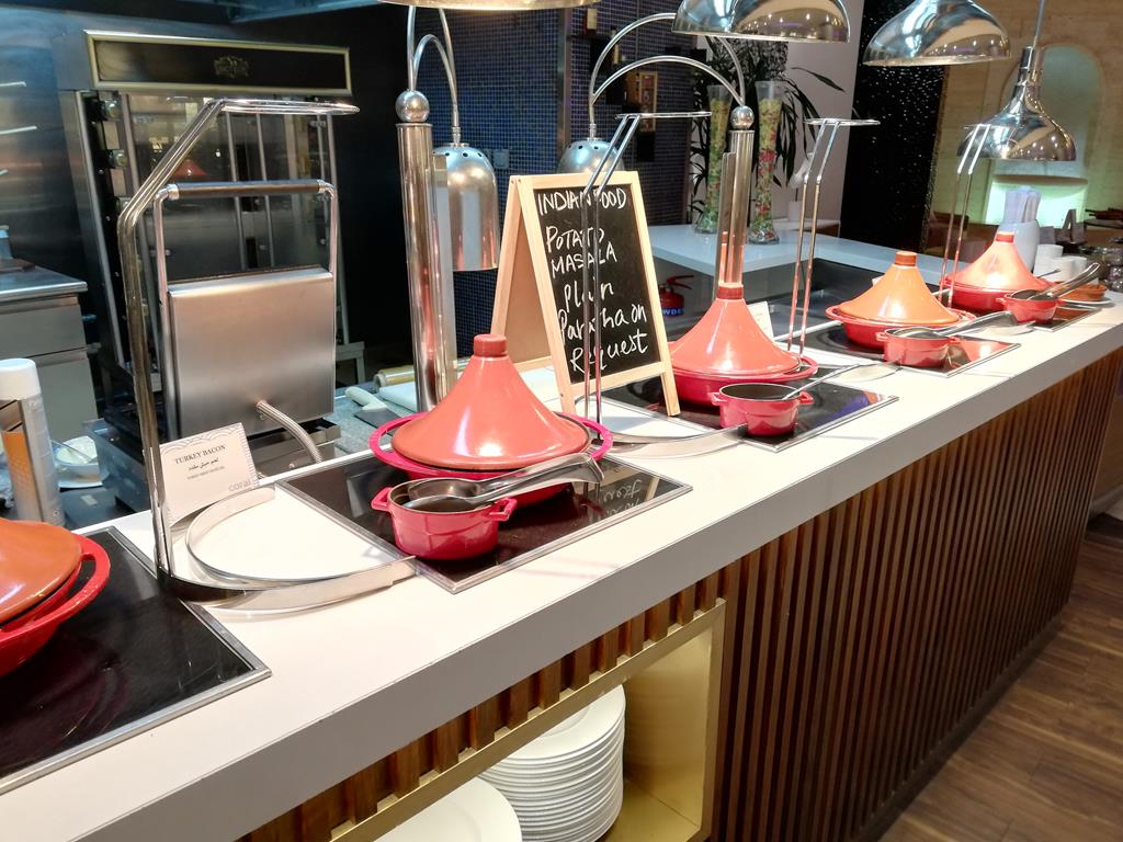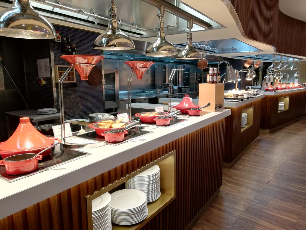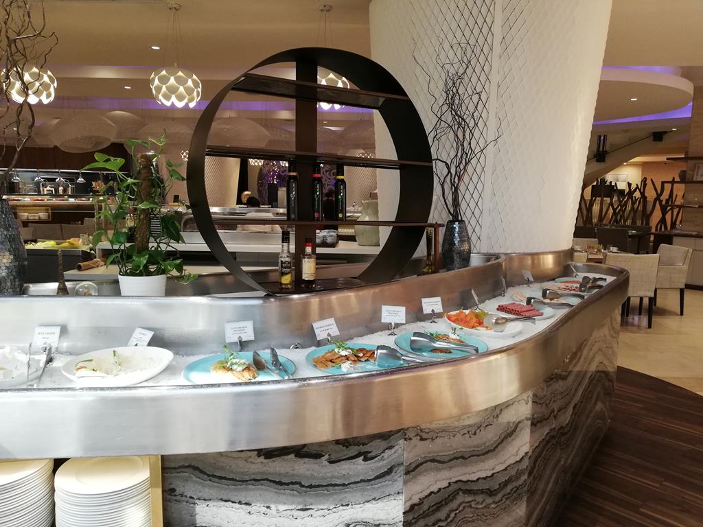 Auf der linken Seite befindet sich der Restaurantbereich und das Buffet. Hier wird mehrmals täglich, abhängig der Tageszeit, Essen serviert. Neben Frühstück, gibt es hier Mittagessen, Afternoon-Team und Abendessen mit einer Happy Hour. Man darf sich am Buffet bedienen, allerdings wird auch am Platz serviert.