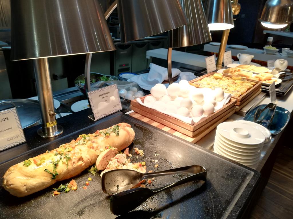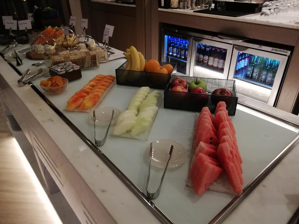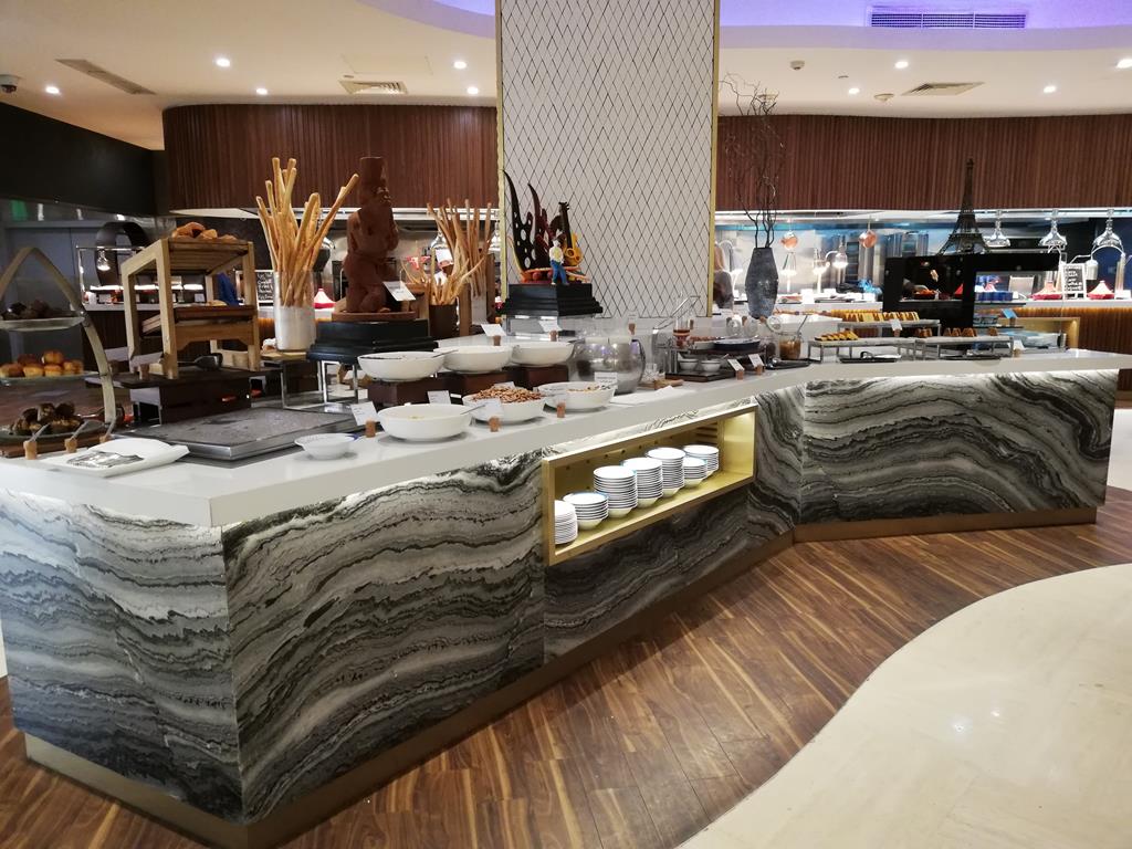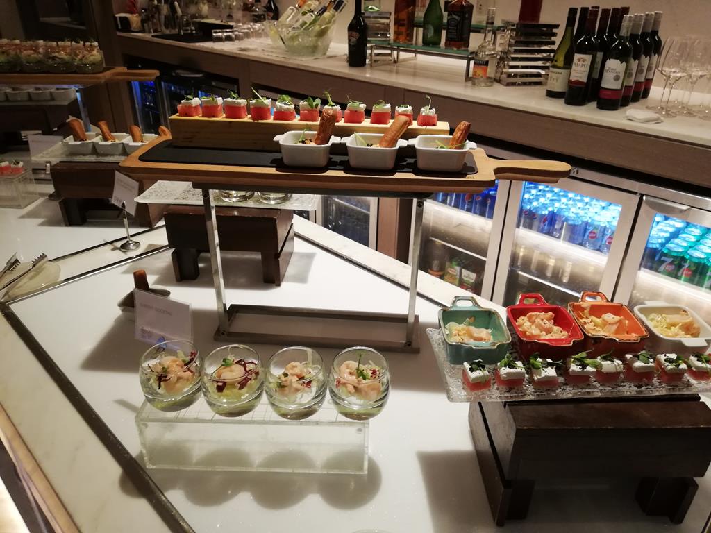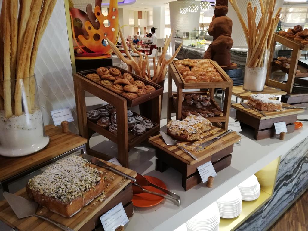 Auf der linken Seite befindet sich der Restaurantbereich und das Buffet. Hier wird mehrmals täglich, abhängig der Tageszeit, Essen serviert. Neben Frühstück, gibt es hier Mittagessen, Afternoon-Team und Abendessen mit einer Happy Hour. Man darf sich am Buffet bedienen, allerdings wird auch am Platz serviert.