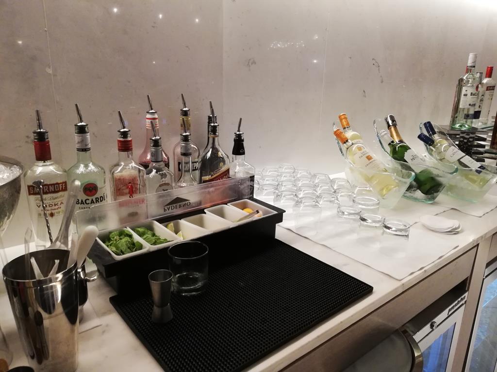 Auf der rechten Seite befindet sich eine Minibar mitsamt Nespresso-Maschine und kostenfreiem Wasser. Der Kühlschrank war gut gefüllt. Die Preisgestaltung fand ich aber ziemlich sportlich. Eine Tüte Chips für acht Euro oder ein Bier für gut zehn Euro sind mir persönlich dann doch zu viel.