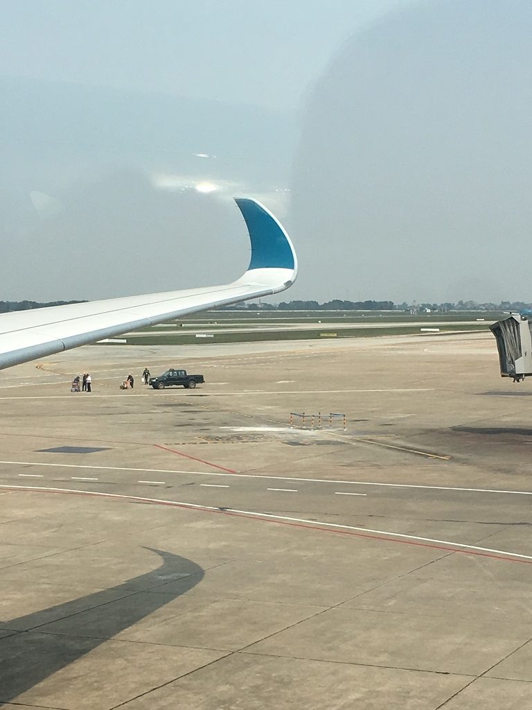 Dann sah ich einen A350 an einem Gate. Könnte das mein Flugzeug sein? Auf einmal wurde es hektisch: Mitarbeiter von Vietnam Airlines hielten Plakate mit drei Flugnummern an einem Gate hoch. Meine war auch mit dabei. Leider erreichte ich das Gate nicht so früh wie gehofft. Denn die Szenen, die sich abspielten waren kurios, denn: man hatte sich entschieden die drei Flüge auf einem zu konsolidieren. Sitzplätze mussten neu verteilt und Bordkarten neu gedruckt werden. Mit meinem Platz am Notausgang des Dreamliners war es sowieso geschehen. Hauptsache mitkommen war jetzt das Gebot der Stunde. Ich bekam einen Sitzplatz am Gang, recht weit hinten. Es hätte schlimmer kommen können.