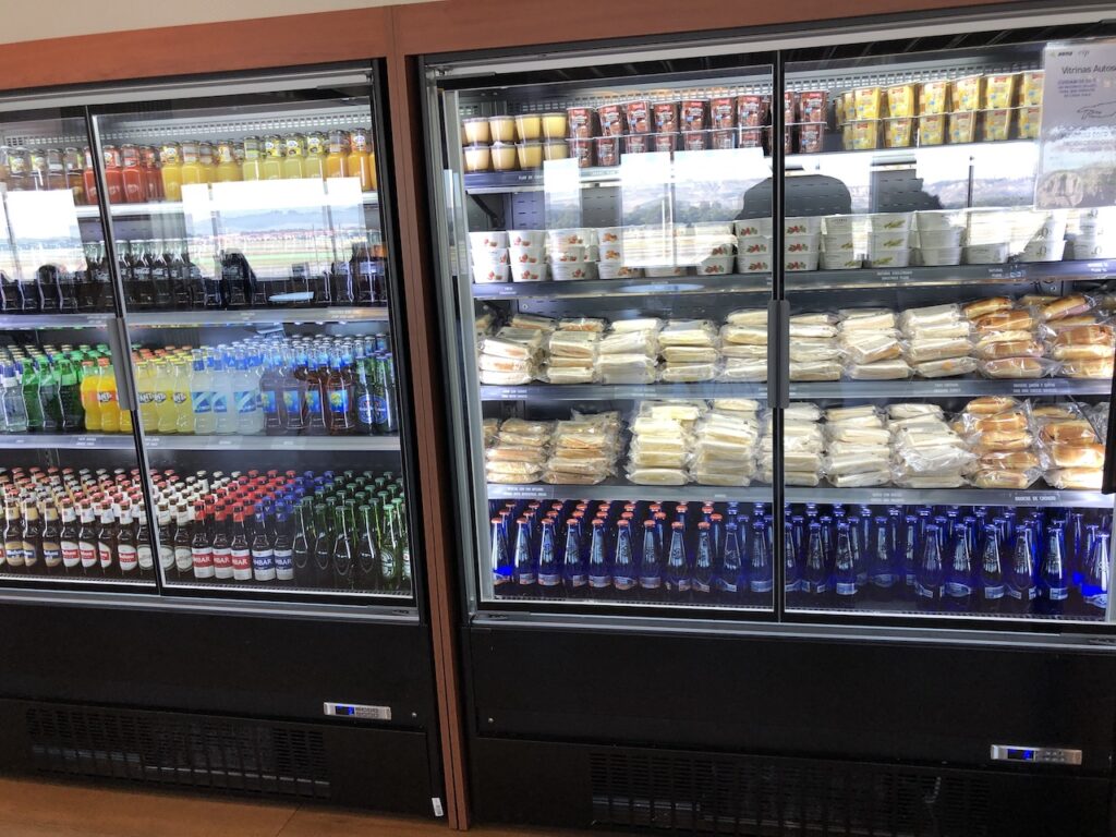 Auch Heißgetränke müssen beim Personal bestellt werden. Hinter der Absperrung sind auch offene Kaltgetränke wie Wein, Spirituosen oder Cava. In einem Kühlschrank stehen Softdrinks und Bier zur Selbstbedienung. Dort findet man auch abgepackte Sandwiches und Joghurt.