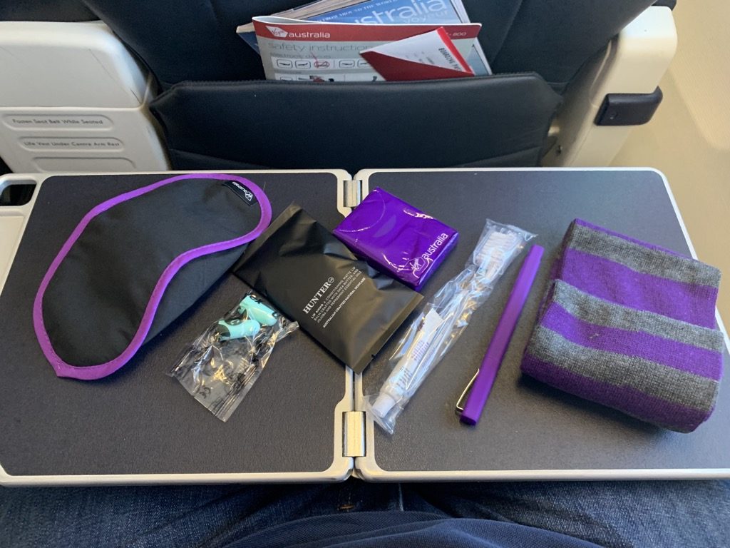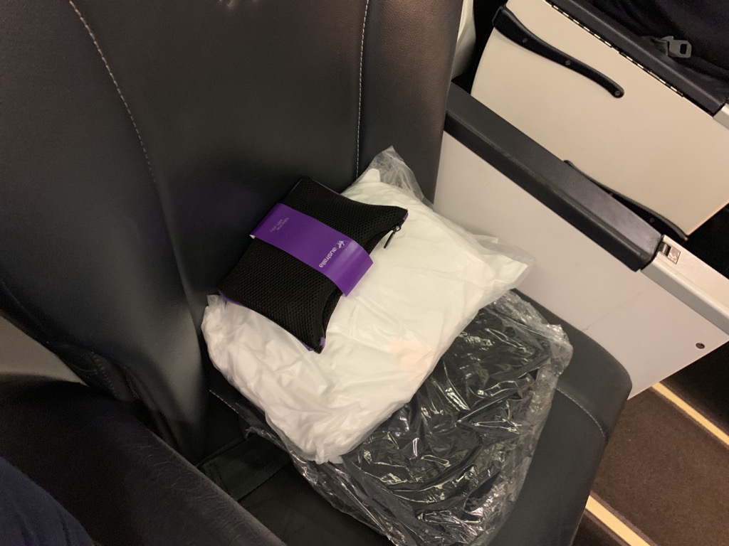 Schon beim Boarding befand sich auf meinem Sitz ein Kissen, eine dünne Decke und ein kleines Amenity Kit. Besonders für einen drei Stunden Flug finde ich ein Amenity Kit durchaus bemerkenswert, auch wenn der Inhalt eher durchschnittlich war.