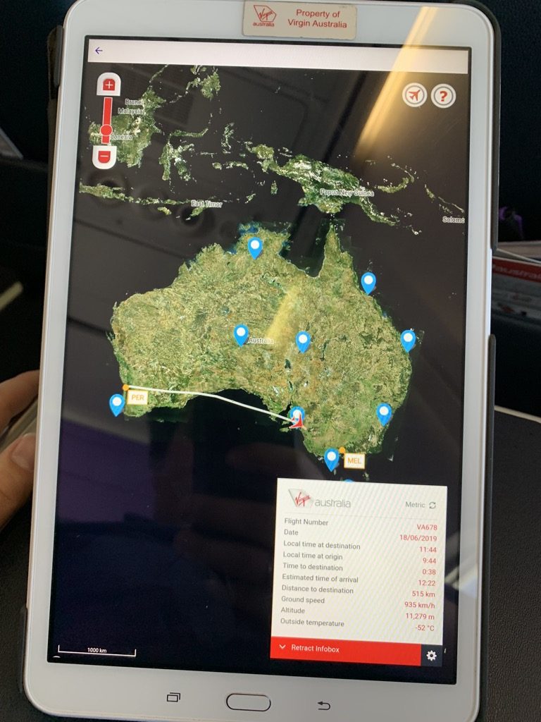 Das Boarding war nach nur 15 Minuten bereits beendet, sodass wir pünktlich in Perth am Gate losgesollt und trotz des sehr regen Verkehrs am Morgen in Perth nur 10 Minuten nach der flugplanmäßigen Abflugszeit gestartet sind, sodass eine überpünktliche Ankunft für Melbourne vorhergesagt wurde.