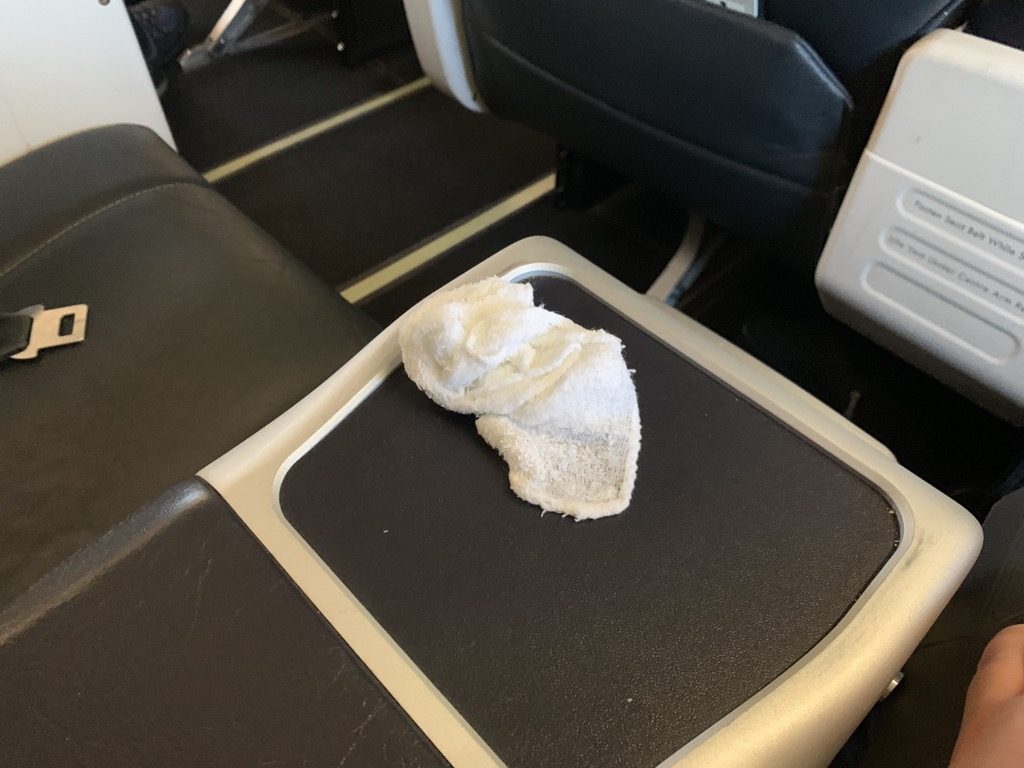 Direkt nach dem Start begann Georgia auch schon mit ihrem Service und überreichte erst einmal heiße Tücher. Diese waren nicht besonders groß, aber für einen drei stündigen Inlandsflug durchaus akzeptabel.