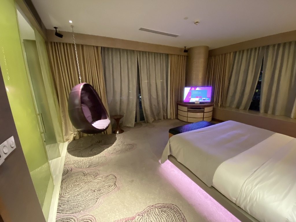 Am Wohnzimmer anschließend kam man in den Hauptteil der Suite, das Schlafzimmer. Hier dominierte natürlich das Bett mit der Wandvertäfelung sowie den unterschiedlichen Nachttischen. Total ins Design gepasst hat hier definitiv auch der Hängesessel. Das Bett war mit mehreren Kissen und einer durchgehenden Decke ausgestattet. Wir haben hier sehr gut geschlafen.