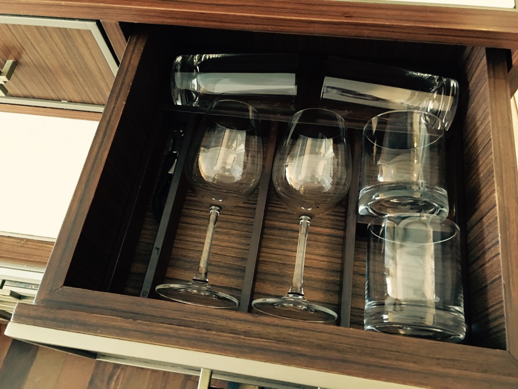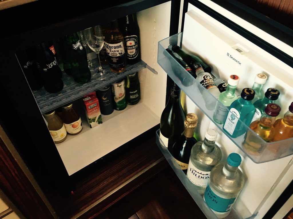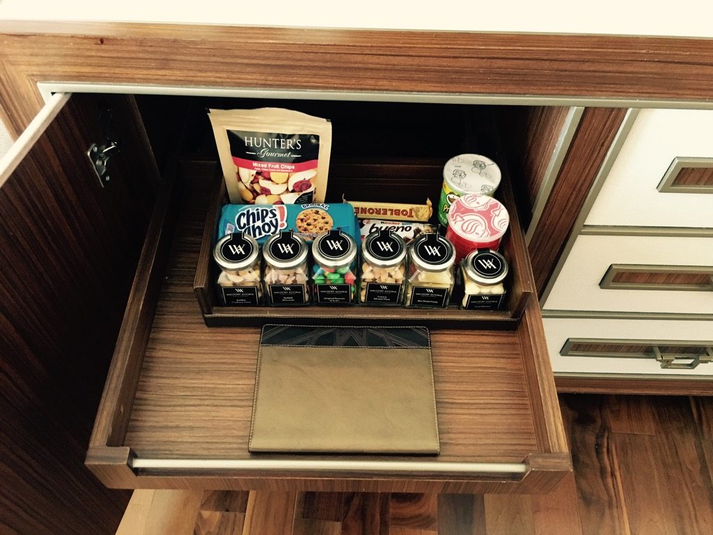 Nach dem Betreten befand sich auf der rechten Seite zuerst der Schrank, der mit den üblichen Dingen ausgestattet war. Dahinter befand sich die Tee- und Kaffeestation, mit darunterliegender gefüllter Minibar.