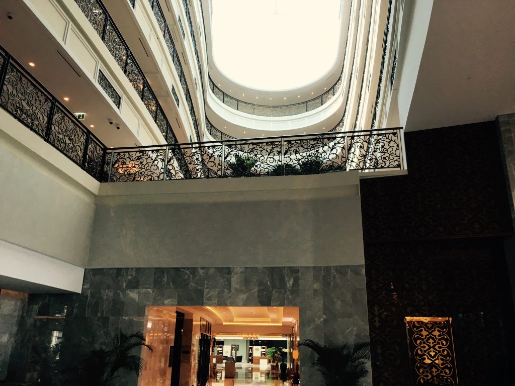 Das Frühstück wurde auf der Ebene unter der Lobby angeboten, von der man auch das Gelände des Hotels betreten kann.