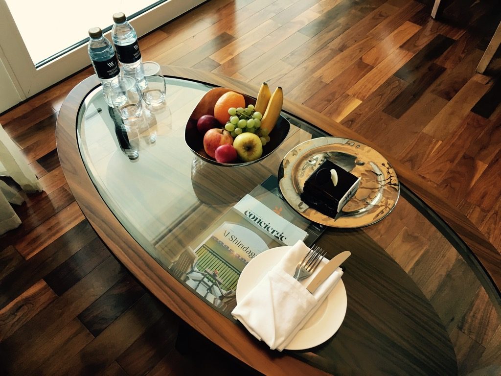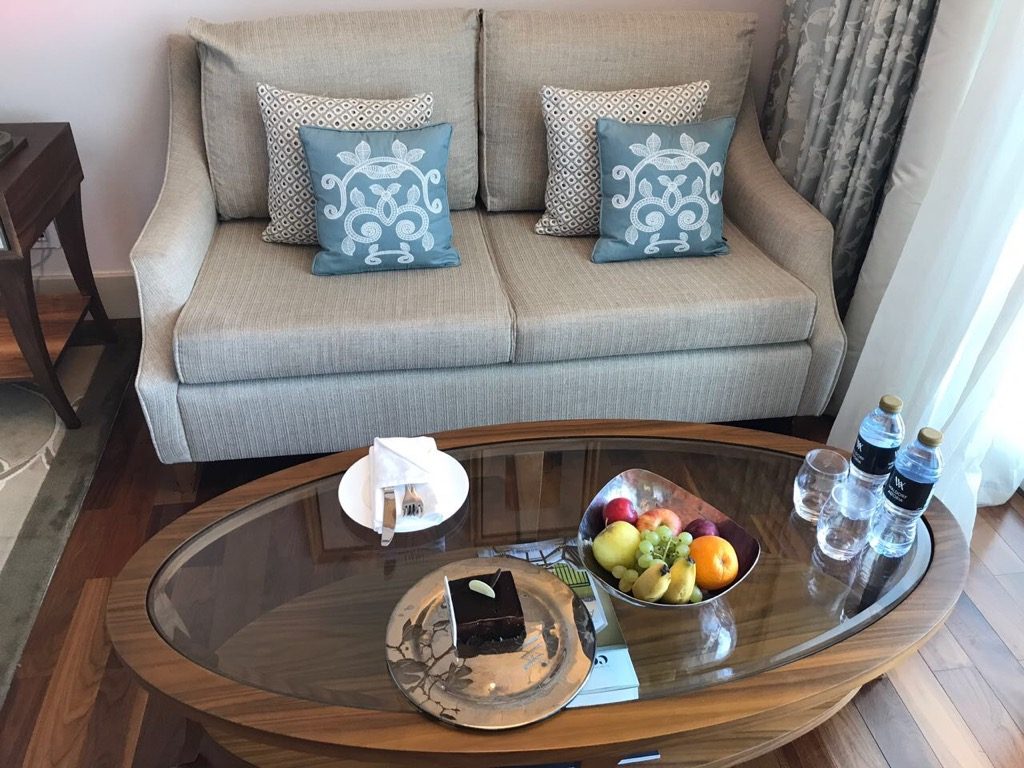 Gegenüber vom Schreibtisch befanden sich mehrere Sitzmöbel mit einem Couchtisch. Auf dem Couchtisch begrüßte uns eine Obstschale und ein kleiner Schokoladenkuchen.