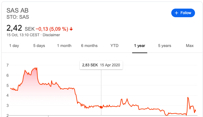 Der Kurs der SAS Aktie liegt bei etwa 2,40 schwedischen Kronen, was umgerechnet etwa 0,23 Euro sind. Damit kann man den Titel als Penny Stock bezeichnen.