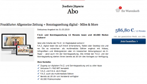 Damit ist dieses Abo nicht mehr die günstigste Option um Miles&More Meilen zu sammeln, aber Ihr erhaltet schnell 40.000 Meilen gutgeschrieben und da es ein Digitalabo ist, bekommt Ihr kein Papier nach Hause geschickt und könnt immer und überall die F.A.Z und die Sonntagszeitung lesen.