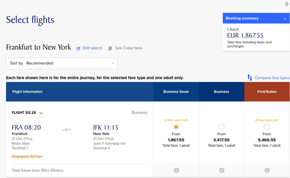 Singapore Airlines Airbus A380 Business Class | Buchungsbeispiel