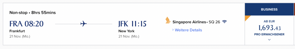 Die Singapore Airlines Business Class ist an sich schon ein Erlebnis. Auf der New York Strecke bietet Singapore Airlines in der Business Class ohne Zweifel das beste Produkt, welches man in der Business Class über dem Atlantik finden kann. Daher sind diese Preise schon alleine eine Erwähnung wert. Wenn man noch bedenkt, dass man direkt ab Deutschland abfliegen kann und nicht erst ins europäische Ausland reisen muss, wird dieser Deal noch einmal interessanter.