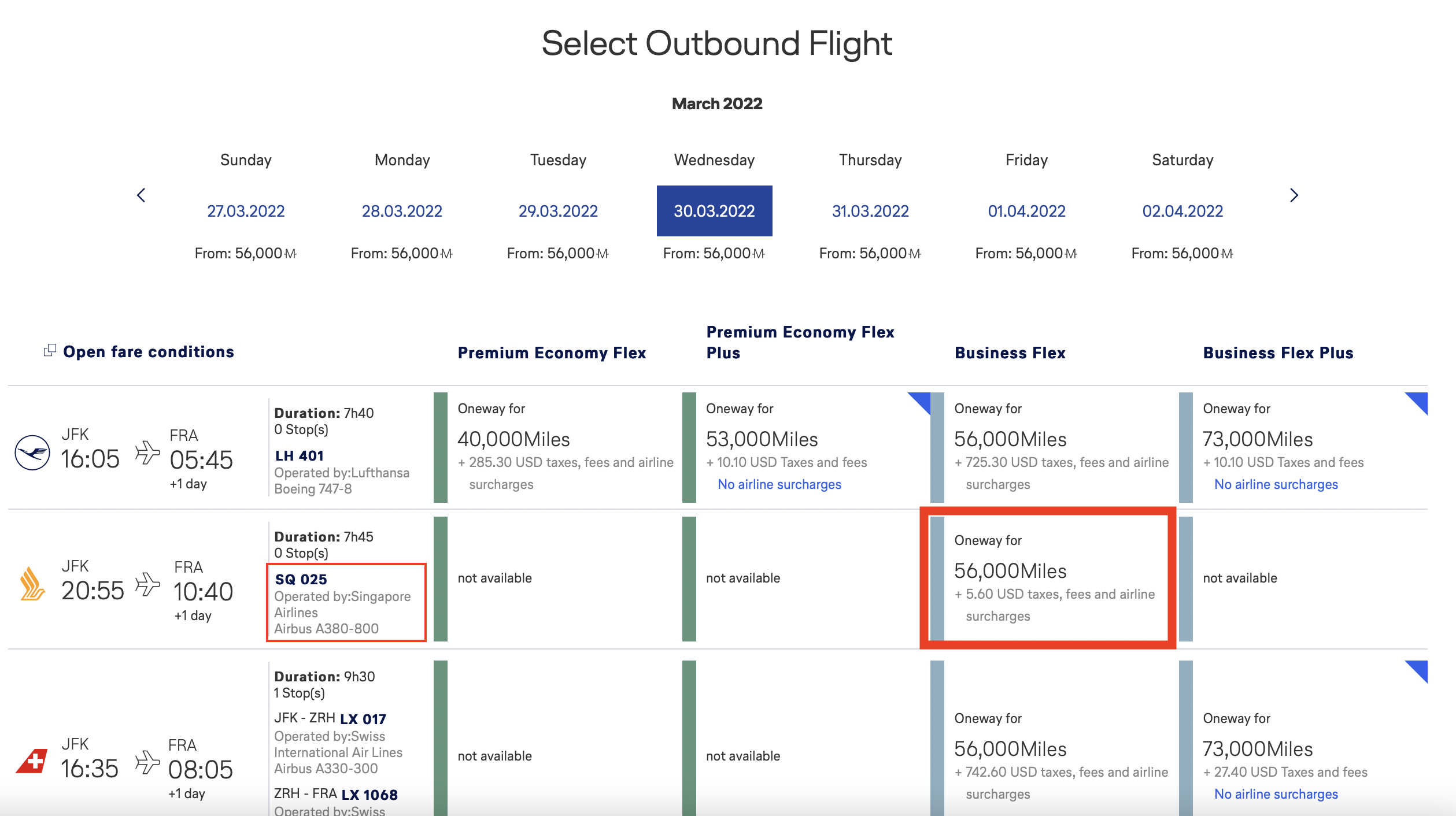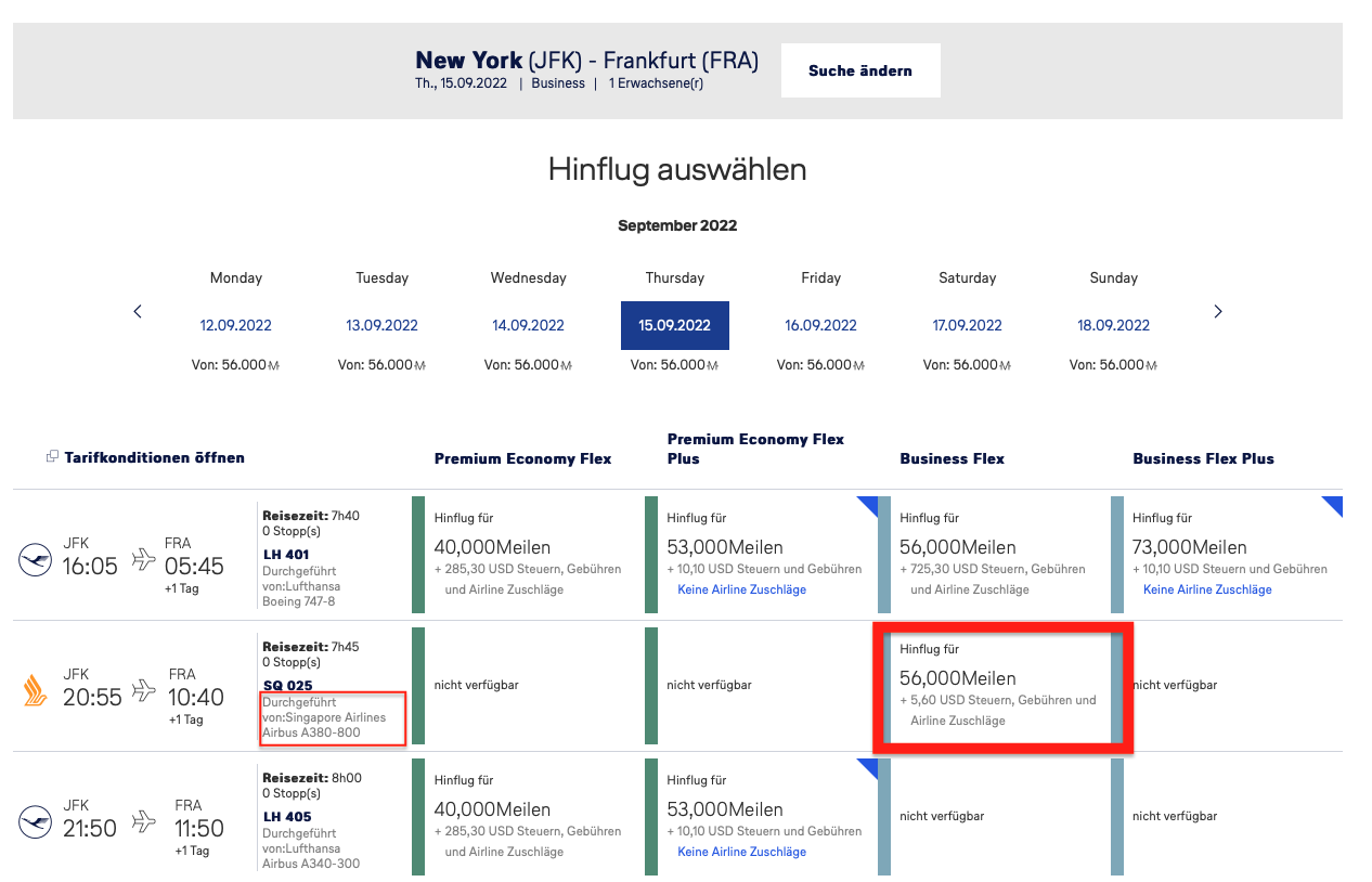 Für einen Flug von New York nach Frankfurt in der Singapore Airlines Business Class im Airbus A380 fallen 56.000 Miles&More Meilen und nur 5,60USD (etwa 5 Euro) an Steuern und Gebühren an, was es zu einem sehr günstigen Prämienflug macht.