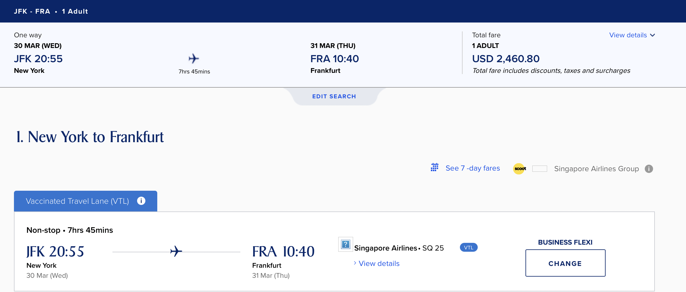 Aktuell kann man die Singapore Airlines Business Class auf den Flügen zwischen New York und Frankfurt (und vice versa) sehr gut und einfach mit Miles&More Meilen buchen, was wohl die günstigste Option ist, diese Flüge zu buchen.