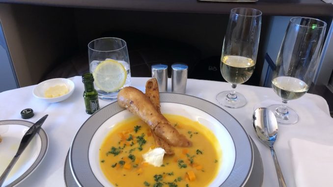 […]In the thorough review from the lounge to check-in and onboard the A380 flight, the passenger wrote he was „lucky“ enough to feel a sharp object in his mouth while sipping his pumpkin mushroom soup.
