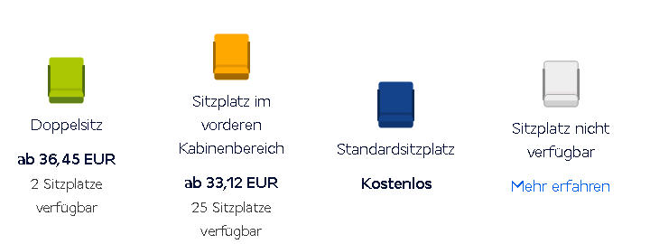 Die volle Auswahl an Sitzplätzen erhält man erst am Flughafen. Hier können die Mitarbeiter am Schalter dann auch auf ursprünglich kostenpflichtige Sitzplätze zugreifen. Wer nicht so lange warten möchte, kauft entweder vorher einen Sitzplatz oder vergleicht die Kosten eines Sitzplatzes mit den Kosten für ein Upgrade in eine höhere Reiseklasse.