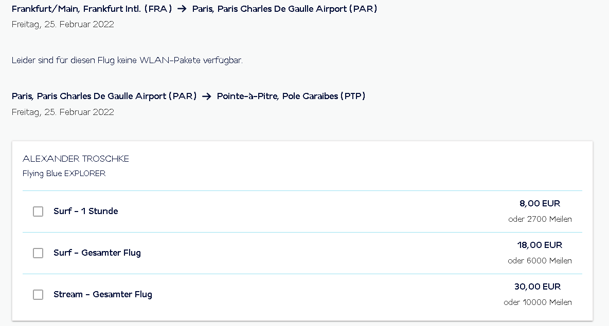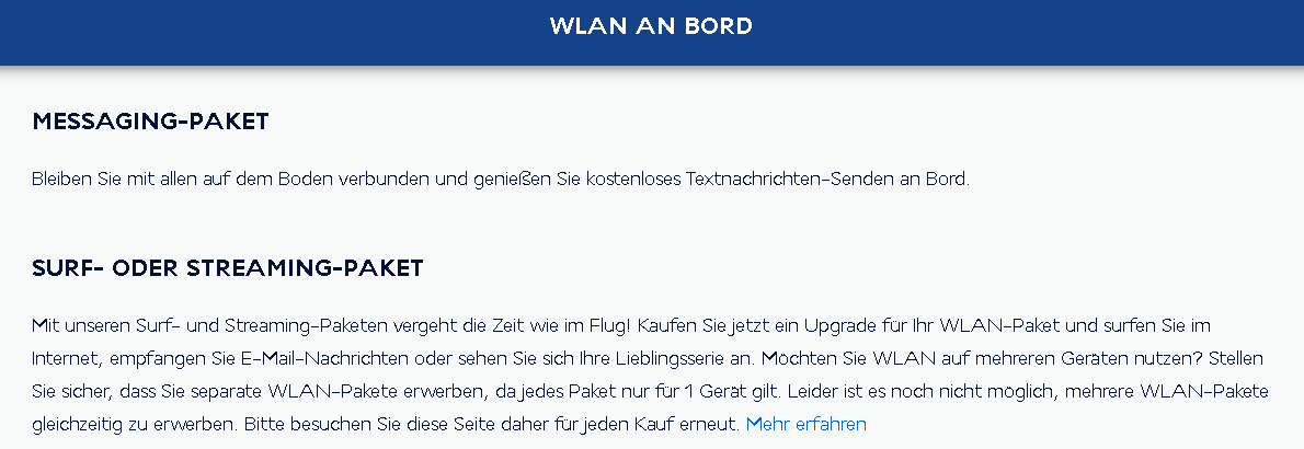 Wer an Bord schnelles WLAN verwenden möchte, kann die Pakete bereits beim Check-In erwerben. Die Gebühren können mit Kreditkarte oder Meilen bezahlt werden.