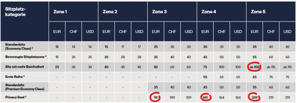 Die Berechnung der fälligen Gebühren für eine Sitzplatzreservierung wird anhand von Zonen durchgeführt. Dabei betreffen die erhöhten Gebühren die Zone 3 (Dubai, Muscat und Tel Aviv), Zone 4 (Nordamerika Ostküste, Mittlerer Westen, nördliches Afrika und indischer Ozean) sowie Zone 5 (Nordamerika Westküste, Fernost und südliches Afrika).