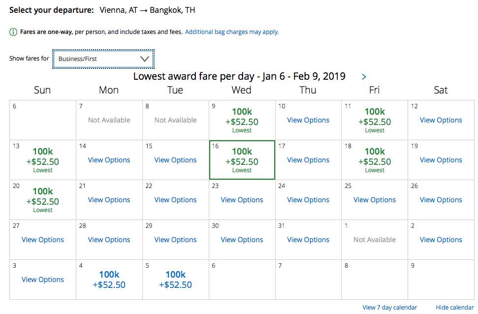 Anschließend bekommt Ihr einen 30 Tage Kalender angezeigt, auf welchem alle Daten markiert sind, an welchen Business Class Non Stop Flüge zwischen Wien und Bangkok verfügbar sind.