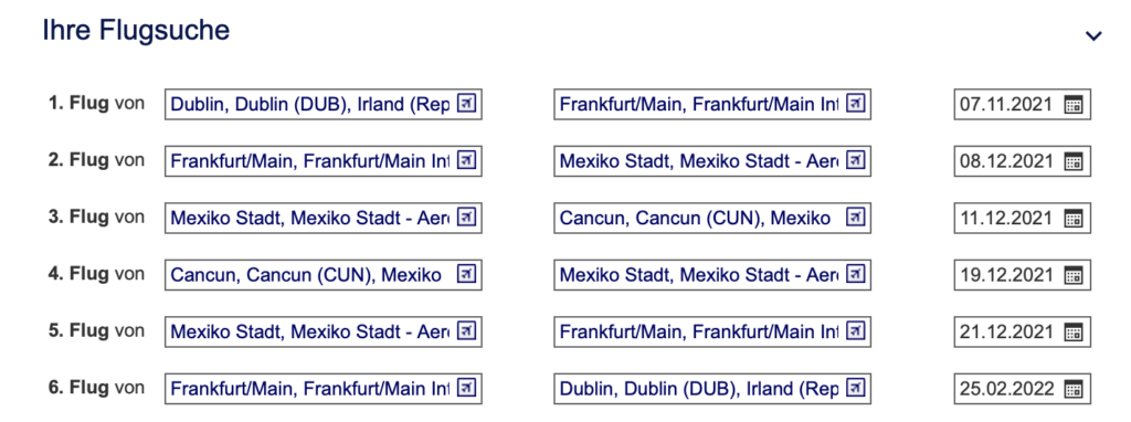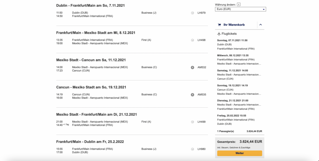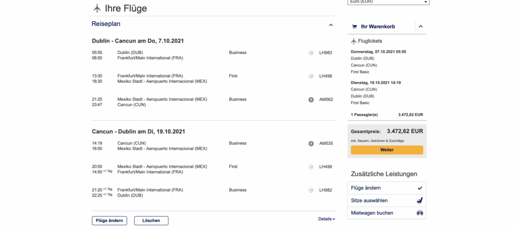 Wenn man diesen Lufthansa First Class Tarif von Dublin nach Cancun einfach durchgängig buchen will, kann man dies ganz einfach über die Buchungsmaske bei Lufthansa machen. Hierbei werden allerdings natürlich keine Stop Over ausgewiesen. Der Preis liegt hier bei 3.472 Euro für den Hin- und Rückflug über Mexico City in der Lufthansa First Class, sowie Anschlüssen mit Aeromexico.