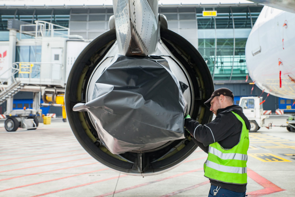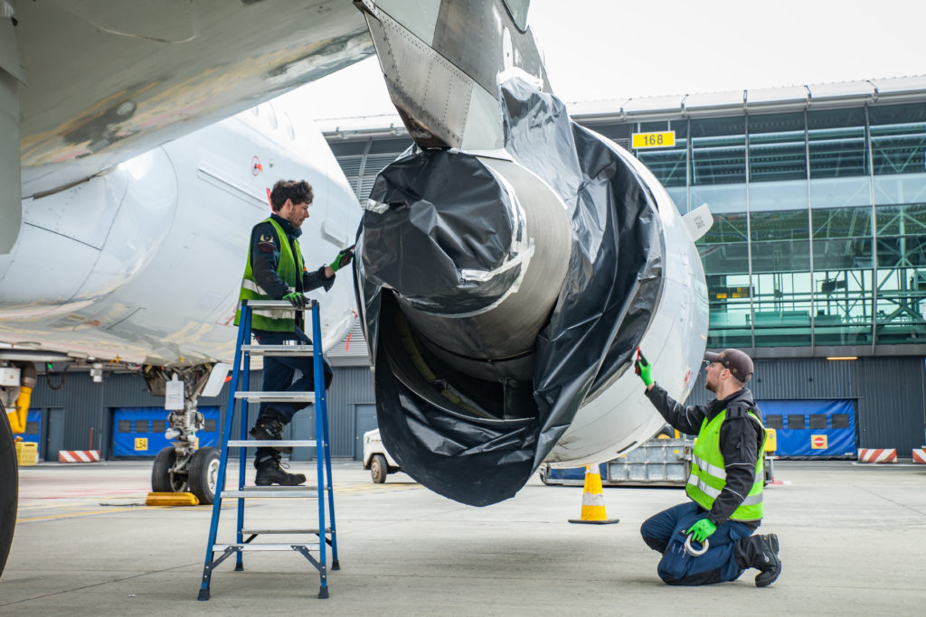 So müssen bei allen Flugzeugen die Triebwerke, Fahrwerke und alle Öffnungen abgedeckt werden um zu verhindern, dass hier Vögel nisten oder Feuchtigkeit eindringt. Auch kleinere Öffnungen an den Flügeln oder an Türen und Ladeklappen werden angeklebt und auch Fenster werden Komplet verdunkelt.