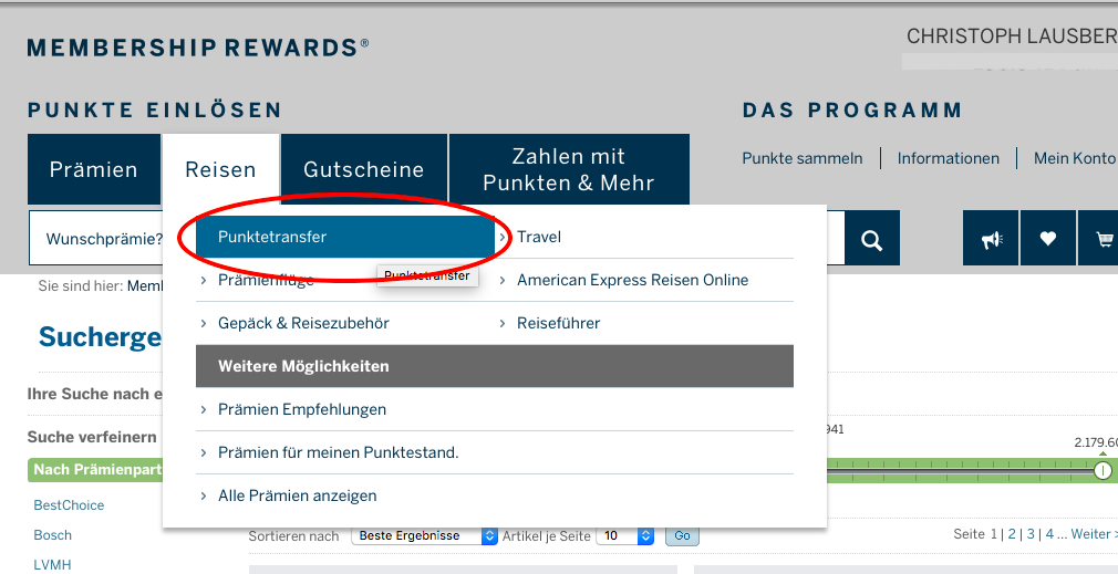 Wenn Ihr Eure Mitgliedsnummer im jeweiligen Meilenprogramm besitzt, müsst Ihr im ersten Schritt Euer American Express Membership Rewards Konto mit den Meilenprogrammen verbinden. Hierfür geht Ihr einfach in Euren American Express Account und hier in den Membership Rewards Bereich. Wählt hier im Bereich „Punkte einlösen“>> „Reisen“>> „Punktetransfer“ aus.