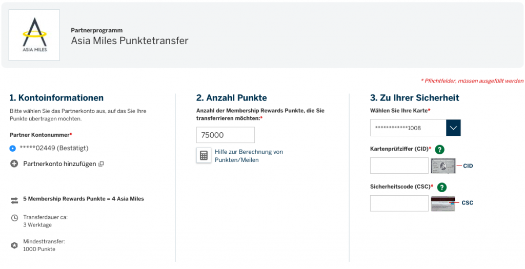 Wenn Ihr nun auf „Punkte übertragen“ unter dem jeweiligen Programm klickt, könnt ihr einfach Membership Rewards Punkte auf das jeweilige Meilenkonto transferieren. Hierfür müsst Ihr nur den Punktewert, welchen Ihr übertragen wollt angeben, sowie die Prüfziffern von Eurer Membership Rewards Karte.