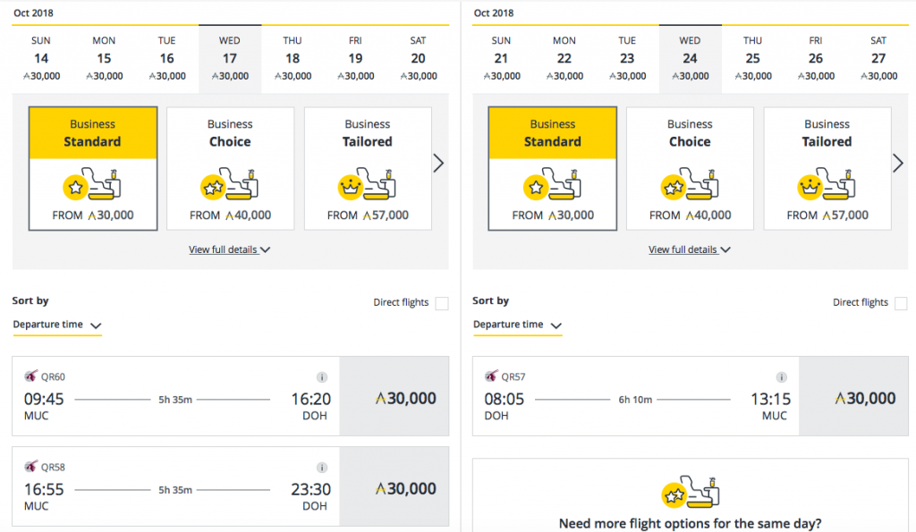 Qatar Airways QSuite Flüge nach München sind extrem gut verfügbar, so dass man hier fast täglich ohne Probleme einen Prämienflug für 30.000 Meilen pro Strecke oder 60.000 Meilen (75.000 Membership Rewards Punkte) für den Hin- und Rückflug in den QSuites buchen kann.