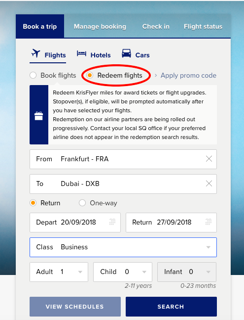 Loggt Euch in Euren Account bei Singapore Airlines ein und sucht einfach direkt auf der Startseite die entsprechenden Flüge. Achtet dabei darauf, dass Ihr „redeem flights“ auswählt um Prämienflüge angezeigt zu bekommen.