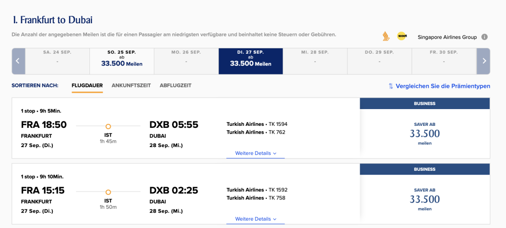 Anschließend könnt Ihr einfach die entsprechenden Prämienflüge auswählen. Ein Hin- und Rückflug in der Business Class nach Dubai kostet immer 67.000 Meilen im Singapore Airlines KrisFlyer Programm und etwa 400 Euro an Steuern und Gebühren. Bei Flügen die über 5.000 Euro kosten können, ein fantastischer Deal!