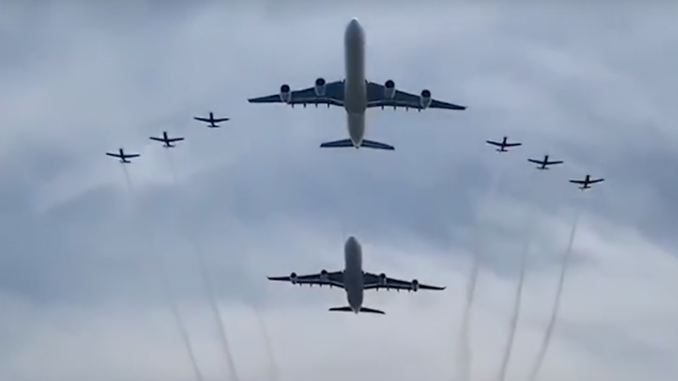 Formationsflüge gibt es bei Flugschauen immer wieder und bei Großveranstaltungen sieht man auch gerne ein Passagierflugzeug mit in der Formation. South African Airways ist zur Amtseinführung des neuen Präsidenten in Pretoria allerdings gleich mit zwei Airbus A340-600 in einem spektakulären Formationsflug geflogen.