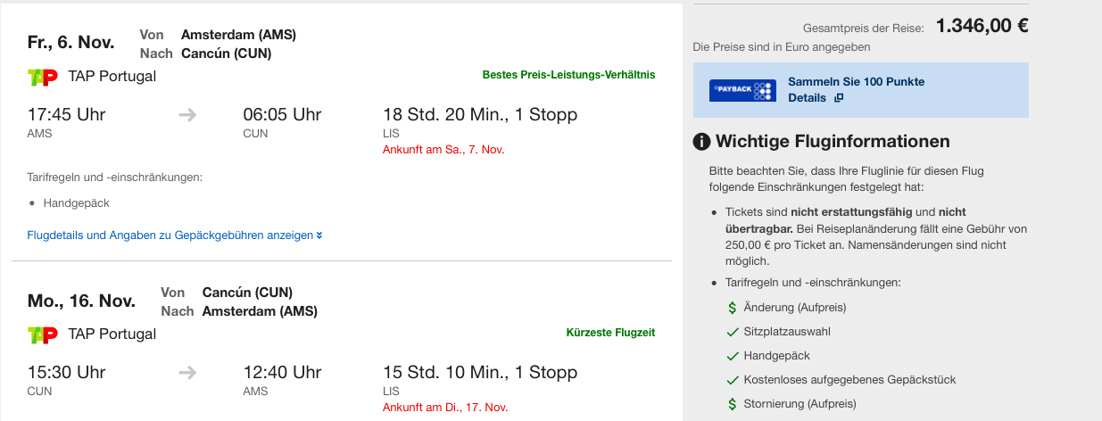 Hinzu kommt, dass TAP Air Portugal nach Cancun mit dem neuen Airbus A330-900Neo fliegt und sowohl den Hin-, als auch Rückflug als Nachtflug durchführt. Hierdurch hat man die maximale Urlaubszeit und bei der An- und Abreise nach Amsterdam verliert man keinen Tag oder muss in Amsterdam übernachten durch eine späte Anruft oder frühen Abflug.