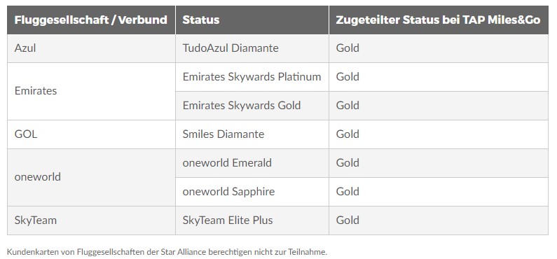 Die portugiesische Fluggesellschaft TAP hat diese Status Match Promotion zum 75. Geburtstag aufgesetzt. Und die Bedingungen sind sehr weit offen. So könnt Ihr mit jedem Status einer Oneworld oder Sky Team Fluggesellschaft den Status Match beantragen. Auch ein paar unabhängige Fluggesellschaften werden akzeptiert.