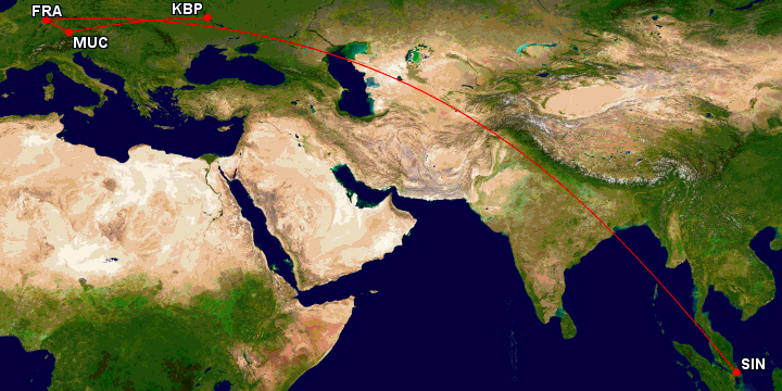 Der längste Lufthansa Flug nach Asien ist der zwischen Frankfurt und Singapur, weshalb wir in diesem Beispiel diesen als Option verwenden werden. Wenn man den Reiseweg von Kiew nach Singapur über München und Frankfurt optimiert, sieht das Routing wie folgt aus: