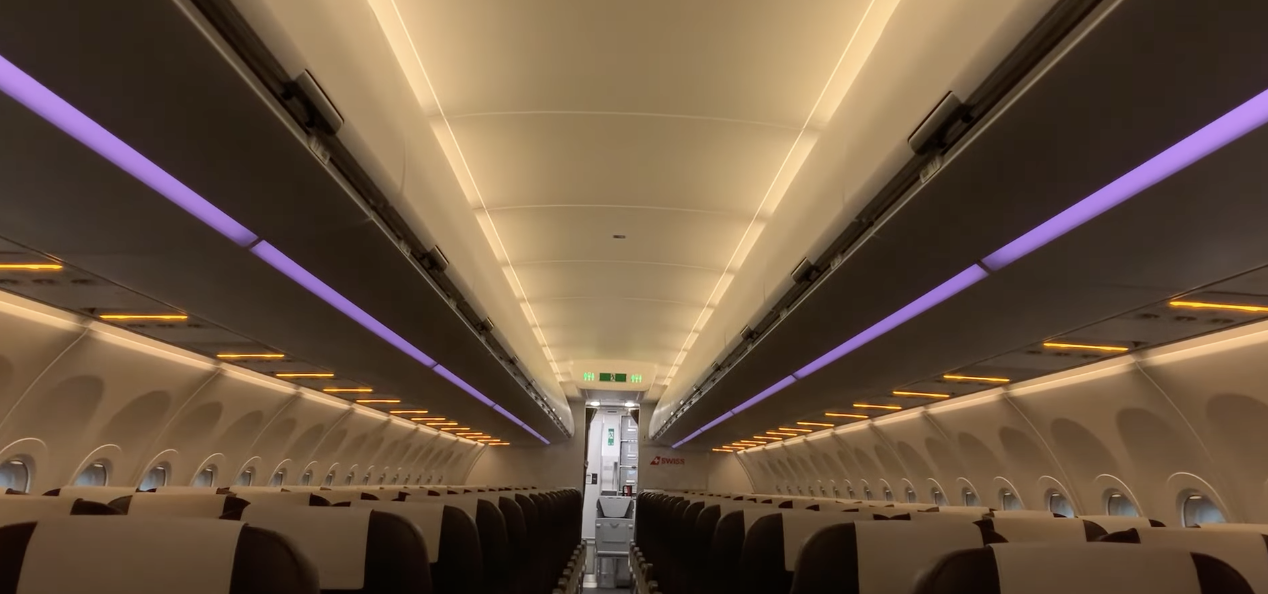 In der Kabine wurde zudem ein modernes Beleuchtungssystem installiert. Das „Human Centric Lighting“ orientiert sich je nach Tages- oder Nachtzeit am Biorhythmus der Fluggäste und taucht die Kabine in verschiedenfarbiges Licht. Statt grellem Kaltweiß können warme Rot- und abgestufte Zwischentöne eingestellt werden, auch ein kühleres Blau ist möglich.