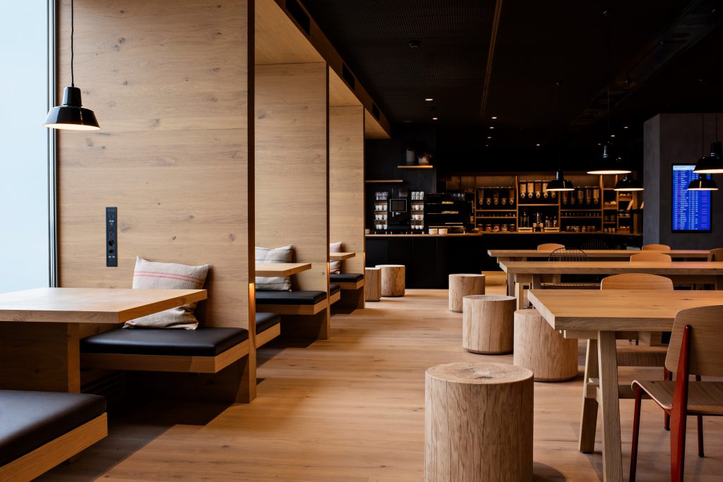 Die neue Swiss Alpine Lounge wurde in einem modernen alpenländischen Design gestaltet, bietet mit den vielen Holz- und Naturelementen einen recht rustikalen Charme und wirkt dabei dennoch modern. Orientiert hat sich Swiss hierbei an Alphütten und scheinbar hat Swiss dieses Konzept auch gut umgesetzt.