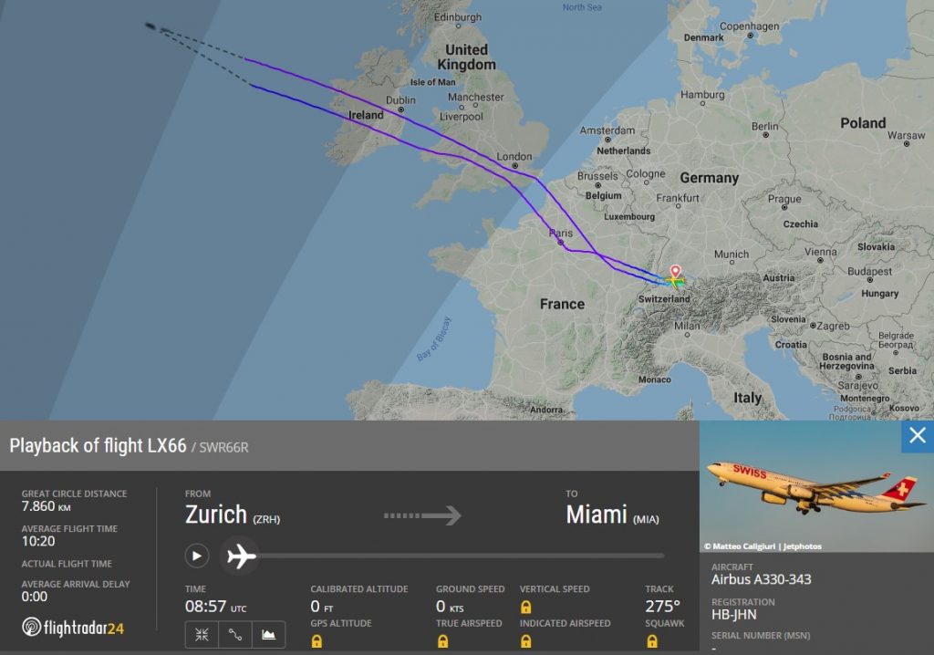 Der Airbus A330 mit der Flugnummer LX66 startete leicht verspätet gegen 10:20 Uhr in Zürich und flog zunächst die geplante Route über Frankreich, Großbritannien und Irland. Nach etwa drei Stunden Flugzeit bemerkte ein Passagier, dass die Toiletten nicht mehr ordnungsgemäß funktionierten. Daraufhin entschied sich der Kapitän etwa 1100 Kilometer nordwestlich der irischen Küste umzukehren und zurück nach Zürich zu fliegen. Dort landete nach Berichten des Aviation Herald der Swiss A330 weitere drei Stunden später.