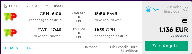 TAP Air Portugal bietet aktuell sehr lohnende Business Class Tarife ab Kopenhagen nach Nordamerika an. Dabei beginnen die Preise für den Hin- und Rückflug bei etwa 1.100 in der komfortablen Business Class.