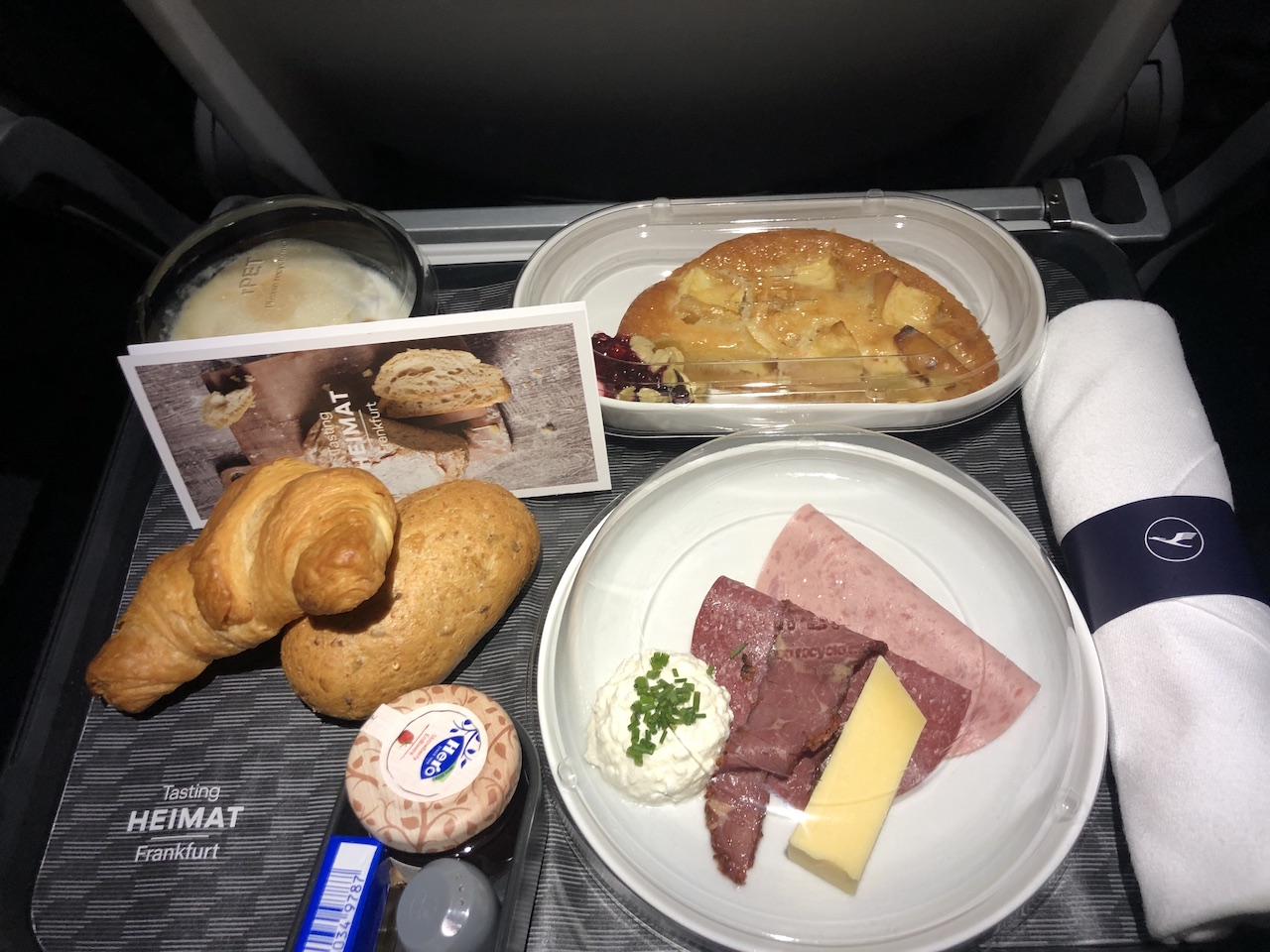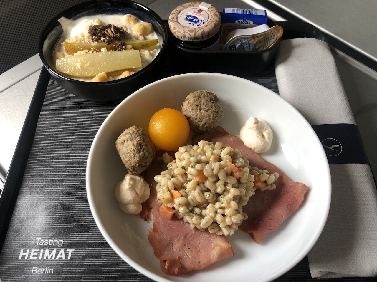 So gab es auf einem innerdeutschen Flug eine kalte Platte mit Roastbeef, Grillgemüse und einem Mousse mit Obst. Auf einer Strecke mit einer Flugzeit von etwa zwei Stunden wurde zum Frühstück eine Platte des gleichen Umfangs aufgetischt. Schinken, Graupen, Fleischbällchen und ein Joghurt mit Obst & Müsli – typisch Berlin?