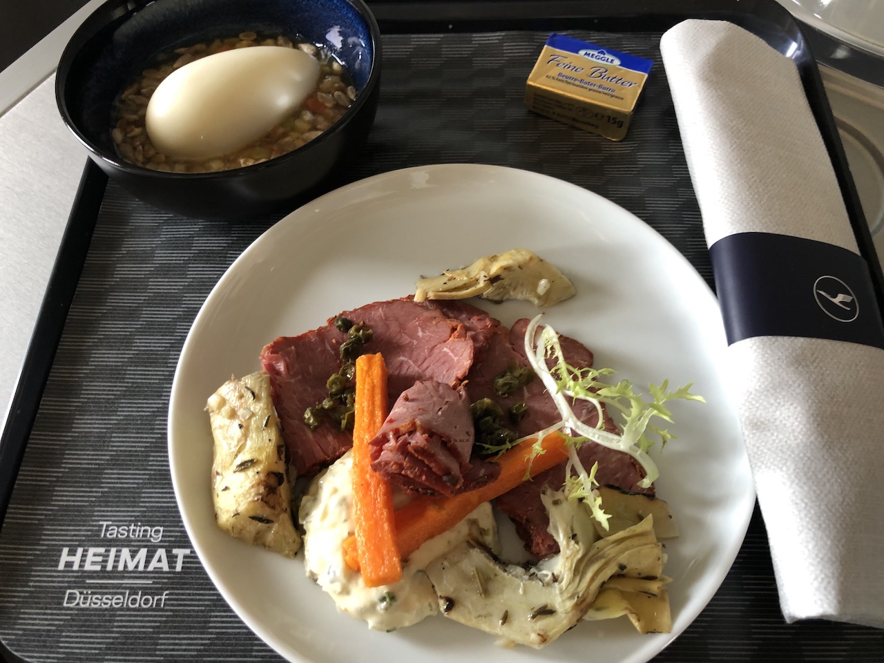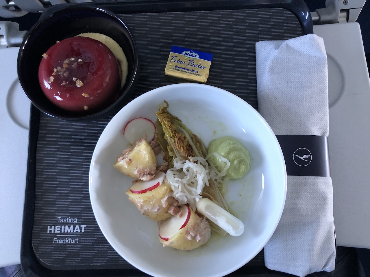 So gab es auf einem innerdeutschen Flug eine kalte Platte mit Roastbeef, Grillgemüse und einem Mousse mit Obst. Auf einer Strecke mit einer Flugzeit von etwa zwei Stunden wurde zum Frühstück eine Platte des gleichen Umfangs aufgetischt. Schinken, Graupen, Fleischbällchen und ein Joghurt mit Obst & Müsli – typisch Berlin?