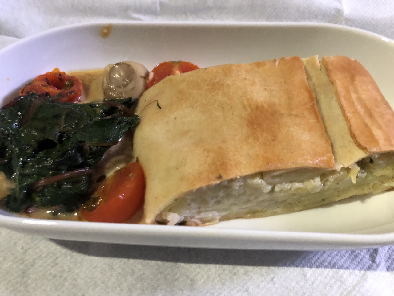 Die Vorspeise kam uns auf dem Hinflug bekannt vor, den Teller kannten wir von einem innerdeutschen Flug. Als Hauptgänge standen zwei Gerichte zur Auswahl: Kohlrouladen und eine vegetarische Quiche. Die Rückreise fand am frühen Morgen statt, die Auswahl beim Frühstück: ein kalter Apfelkuchen oder pochiertes Ei mit Lachs.