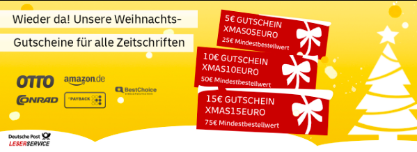 Der Deutsche Post Leserservice hat zur Weihnachtszeit drei Gutscheine aufgelegt, durch welcher man zehntausende Miles&More Meilen zum Schnäppchenpreis sammeln kann. Meistens ist unser Gutschein, FLYER5EURO, die beste Option um 5 Euro auf die Prämienabos zu sparen. Bis zum 1. Januar 2020 bietet Euch der Leserservice allerdings drei Gutscheine an, mit denen Ihr gleich bis zu 15 Euro auf den regulären Abopreis sparen könnt. Hierbei entstehen einige extrem gute Angebote, mit welchen man das Meilenkonto zum Jahresende noch einmal mächtig auffüllen kann.