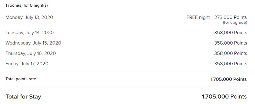 Ob es sich dabei derzeit noch um einen Rechenfehler handelt, ist unklar. Es scheint aber auf jeden Fall so zu sein, dass das Hotel in Kategorie acht (85.000 Punkte) angelegt ist und die restlichen Punkte als Upgrade aufgeschlagen werden, da das Hotel kein Standardzimmer hat. Ziehen wir nämlich von den 358.000 Punkten die 85.000 Standard-Punkte für Kategorie acht ab, kommt man auf die 273.000 Punkte für die „Free Night“.