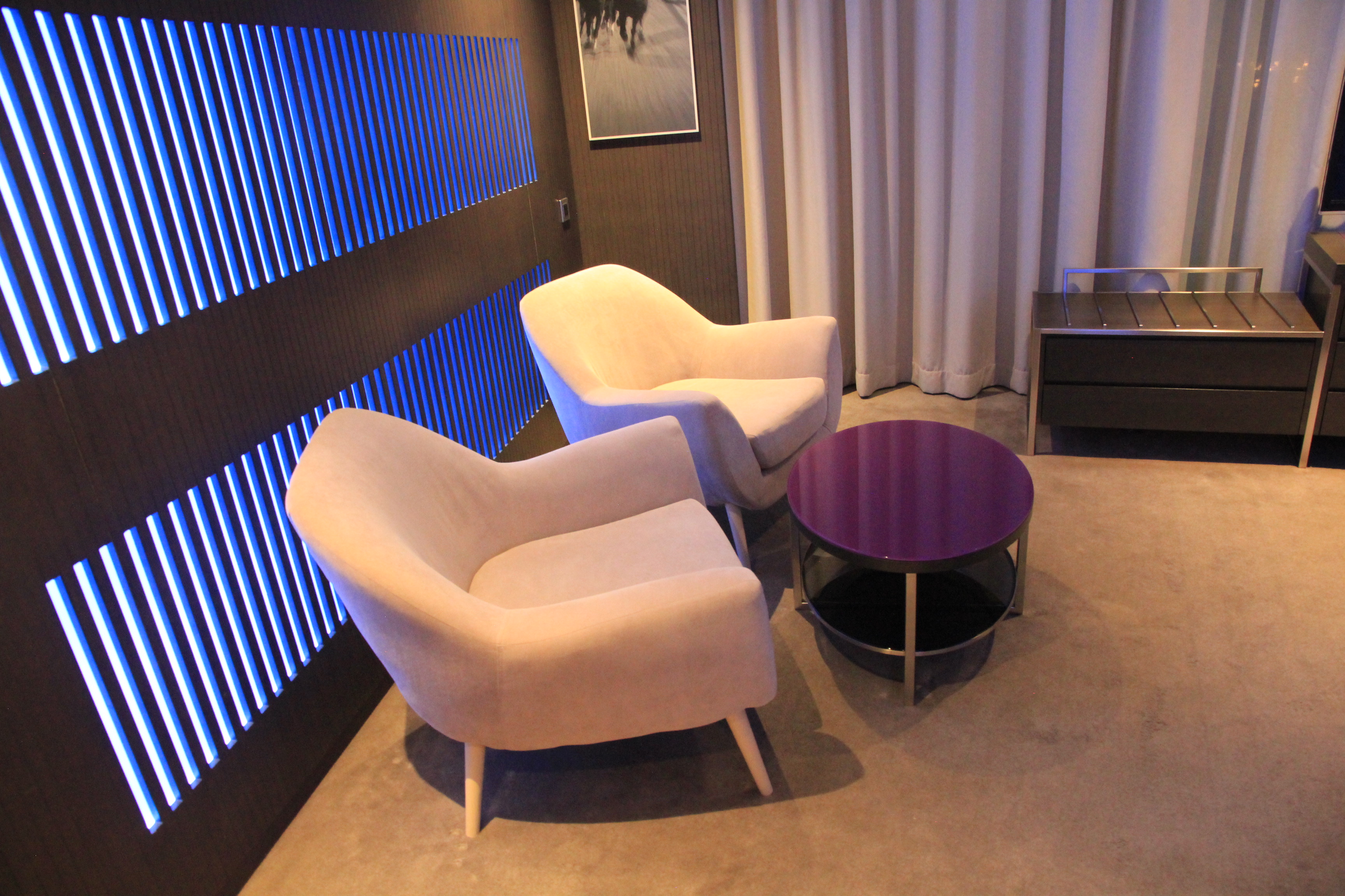 Entlang der großen Fensterfront befindet sich der Schreibtisch. Hier gibt es selbstverständlich Steckdosen um seine Geräte zu laden. Super finde ich das iPad, mit dem man so ziemlich alle Funktionen des Zimmers einstellen kann. Neben der Farbe der Lichter, lassen sich die Vorhänge, Lichter und andere Dinge im Zimmer verstellen. Links dahinter befindet sich der große Fernseher.